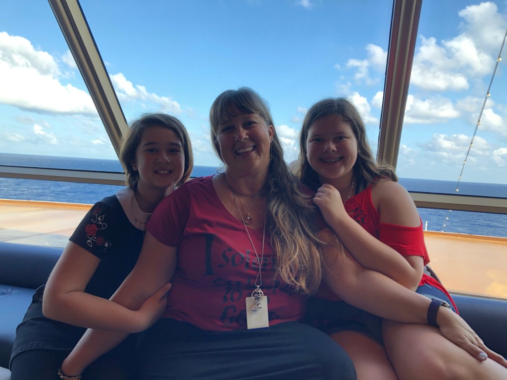 Happy Tuesday everyone. It is our last sea day before we get our first chance to step off the ship. Did anyone else feel that earthquake last night or was it just us? There was an earthquake in Puerto Rico last night and it was felt here on the ship. The captain said it was only the second time in his career that he had experienced something like that. Most people slept through it, but it did wake me up and I rolled up and went back to sleep. Today was another day filled with never ending activities. I had breakfast with Megan and then she went off to do school and I had a nail appointment. Valerie had breakfast with Nana and then she went of to do school as well. We all met back up in the late morning to again participate in the crochet group who is making blankets for project Linus. Megan learned how to do the double crochet stitch so she can move along a little faster now. At 1:00pm every sea day, Valerie has a math tutor who will be assisting her in all her Math lessons. Such a wonderful lady we got to meet this evening. She will dedicate many hours of her vacation time to help the three Algebra students on the ship by the end of the cruise. I could not more thankful for her dedication to my daughters learning. Megan did a watercolor class at 1:00pm while I had lunch with mom. At 2:00pm we attended a talk titled, “Brazil as a Melting Pot,” another wonderful educational experience for the girls. Their curriculum is being supplemented so very well by all the talks and classes being offered here on the ship. It has exceeded all my expectations. After the talk, we dashed up to the Crow’s Nest for a Jive and Swing dance class. It was so much fun. The girls were great sports and it was enough to get our heart rates going. Megan got in the circle and they rotate the women around so they have different dance partners throughout. She stepped right up and danced with multiple gentlemen as I stayed outside the circle and assumed the lead because Valerie did not wish to dance with strangers. We laughed a lot and had such a great time. After dance lessons there was a trivia game and happy hour. They brought the girls snacks and popcorn and Shirley temples and they were so spoiled. I absolutely could not be more impressed with the way the staff is taking such wonderful care of my girls. I feel like family and it has only been a few days. We are starting to see some of the same passengers over and over and I have no doubt that by the end of this trip we will know almost everyone. Megan says she really hopes we do. Our last event of the night was another beautiful sunset view at our window table in the main dining room. It is 8:00pm ship time and we are all ready for bed. We are wiped out and tomorrow we have to be up at 7:00am. I owe you all a story about my phone call too. I will be sure to share it with you tomorrow. Sending you love and hugs from off the coast of St. Kitts…Debra