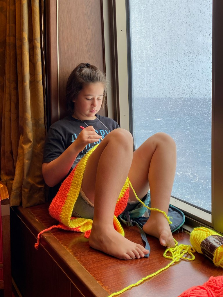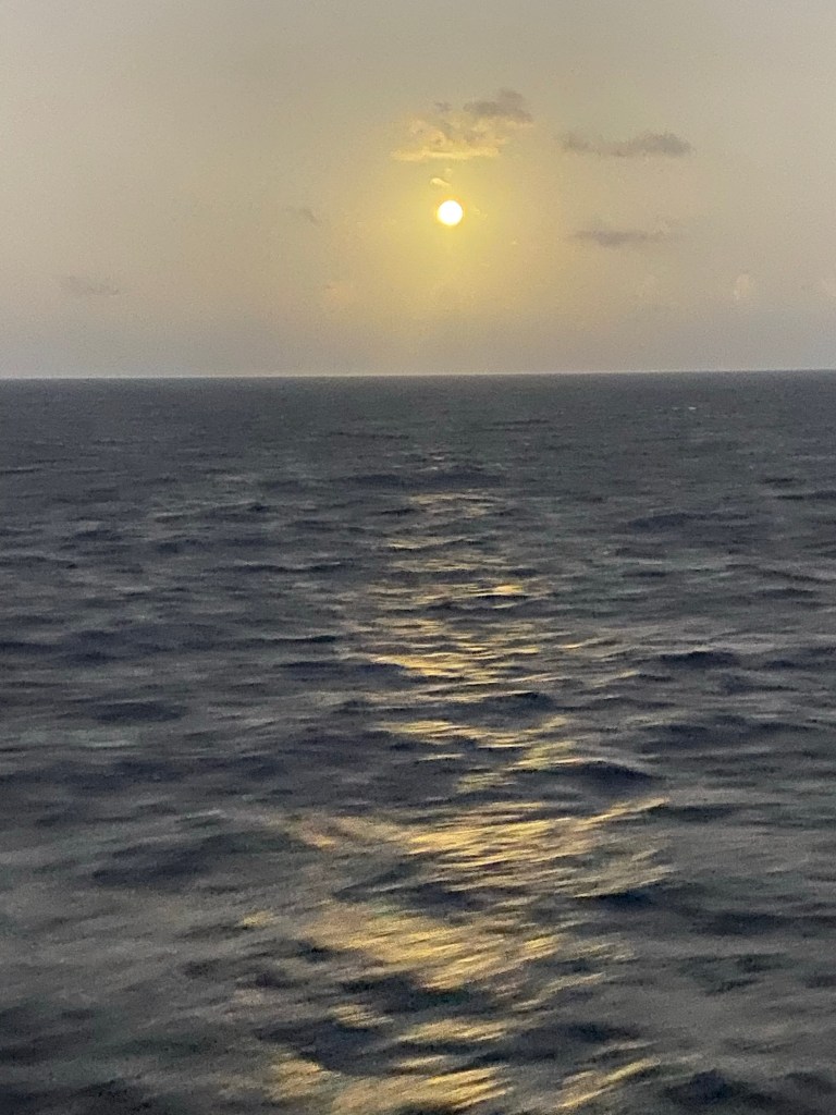 We have officially been on the Holland America Amsterdam for a full week. It is hard to believe it has only been a week. We have done so much in the last seven days that if you had asked me, I would have said it feels like we have been on board at least two weeks. We all slept in this morning as Valerie had an especially rough night. Luckily she was sleeping with me so I could take care of her. The seas are especially rough and there has been a lot of motion to the ocean in the last 24 hours. We also added another hour to the time difference so we are officially 5 hours ahead of you all in California. Megan and I had breakfast together this morning and then headed over to the knitting and crocheting group that is working on the Project Linus Blankets. Next, Megan and I went to a watercolor painting class and then we met up with Nana and Valerie for an informational talk on Devil’s Islands and Belem, Brazil our next two ports. It was interesting to learn about the history of the prison on Devil’s Island. There are no official excursions on the island tomorrow. We just get to tender off the ship and then do a self guided walking tour once on land. They provided us with maps of what we are looking at. They also said there are resident monkeys, anacondas, birds and reptiles that live there as well. The girls are excited to see the monkeys. Tonight was our second Gala night. It was officer’s night and we invited an officer to join us at our dinner table. A cadet that works on the bridge shared so much information about the ship with us at dinner. He is only 23 years old and has been on the ship six months. He is going to be returning to the Netherlands for another year of Navigation schooling in February. He was super sweet to the girls. We asked to have an officer with us at every Gala evening if they would like to place one with us. We are also excited to have dinner with the captain and his wife at some time this cruise. So tonight is a gala dance in the main theater and then a “chocolate surprise”. I’ll let you know what that is later. We also had our first full moon tonight. It is especially beautiful out here in the middle of the ocean to see the moonlight reflecting off the sea. It is very romantic. Just me and my Jack (Daniel’s) watching the moon rising in the night sky….ahhhh. In case I haven’t already said this, the food is amazing. I have had sushi for lunch every single day I have been on the ship. Dinners so far have been filet mignon, Lobster, prime rib, Lamb and Shrimp. The appetizers are great and the soup is to die for. I have been trying to skip desserts and exercise daily. I hope to lose a little weight and ultimately, not gain any. We’re off to the show. Music and Magic tonight and then the Gala event…I’ll let you know tomorrow what the chocolate surprise was. Love and Hugs from the Caribbean. Next stop Devil’s Island.