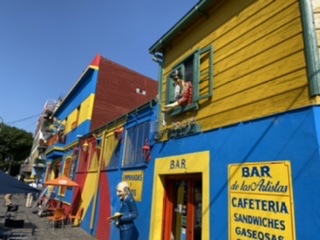 Buenos Aires, Argentina. What a beautiful place we visited today, despite the fact that the temperature topped 90 degrees today. We took a drive through the highlights of the area. We visited San Telmo, Recoleta and La Boca. There were 24 plazas in downtown representative of the 24 “States” of Argentina. We went inside the Metropolitan Cathedral. I am always in such awe of the beauty and grandeur of the Cathedrals we visit when we are abroad. In Recoleta we visited the cemetery that has 6,400 statues, sarcophagi, coffins and crypts of many notable people, including Eve Peron. We went to a home-hosted lunch and had a fabulous meal. Lastly, we went to Cafe de los Angelinos and saw an amazing Tango show. It was a full eight-hour day, but it went by so quickly. We didn’t make it back on the ship in time for our 5:15 dinner seating so everyone went their separate ways to shower and rest or swim and then have dinner at the buffet. I went and walked the track with Megan and then we played pickle ball. I am finally feeling a little better. I started antibiotics yesterday and will stay on those for a few days to try and kick this out the rest of the way. Tomorrow we will be in Montevideo, Uruguay. We are ever vigilant of our surroundings and are staying safe. Now if we can all be healthy again, we will rock this trip even more. Love and Hugs from us to you all. Debra