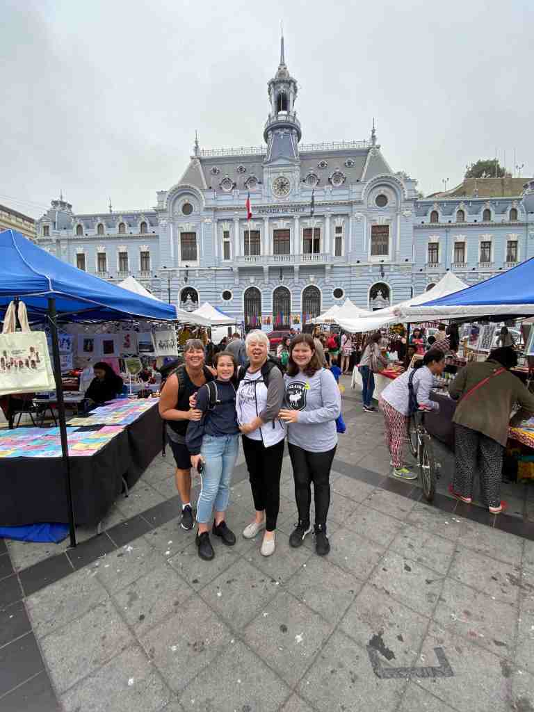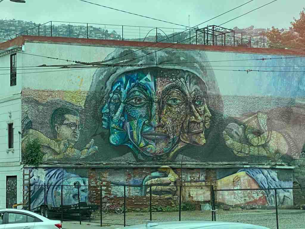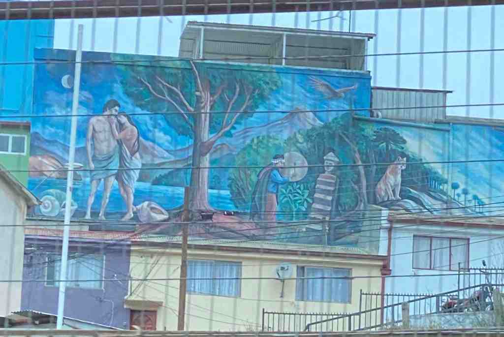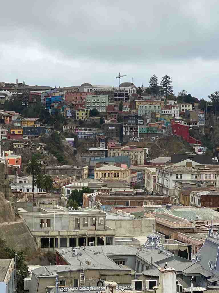 Another day in Chile. I thought we were going to be coming into Santiago, but I was mistaken.  Our port of call was actually San Antonio and we actually drove about 90 minutes away to Valparaiso where we spent the day.  We drove to the scenic outlook overlooking the city and saw so many beautiful murals painted on buildings.  The town has 42 hills and was an array of fine mansions, tattered houses and shacks.  We saw the Naval Headquarters, the bank district, the Monument to the Heroes of Iquique, the stock exchange, and the cathedral at Plaza Victoria. We also had the opportunity to ride in two different funiculars.  That was quite an experience; mom said it reminded her of the tram she rode in to get to the Shadowbrook resteraunt in Santa Cruz, Ca.  We toured inside the La Sebastiana museum, home of Noble Prize winner Pablo Nerunda.  We had a delicious lunch at the hilltop overlooking the city and what they call the “bay area”.   We then had a 90-minute bus ride back to the ship.  We spent too much time on the bus today for my taste.  But it was still a wonderful day.  It was the first time I was able to wear shorts in a long time.  Still needed a sweatshirt today, as it was mostly overcast.  But it reminded us of the weather at home.  So now our adventure will take us 2000 miles out into the open sea as we travel west to Easter Island.  We have four seas days ahead of us before we will touch land again. Are average speed is said to be around 30 knots and we can already feel the swells just a short distance out of port. We also finally give an hour back tonight so starting tomorrow we are only four hours time difference from our loved ones in California.  Valerie put on her seasickness patch and I am going to take a shower, it’s ok, there’s lots of grab bars in there.  Here’s to a gentle rocking and a peaceful nights rest.  Adios Chile!  Debra