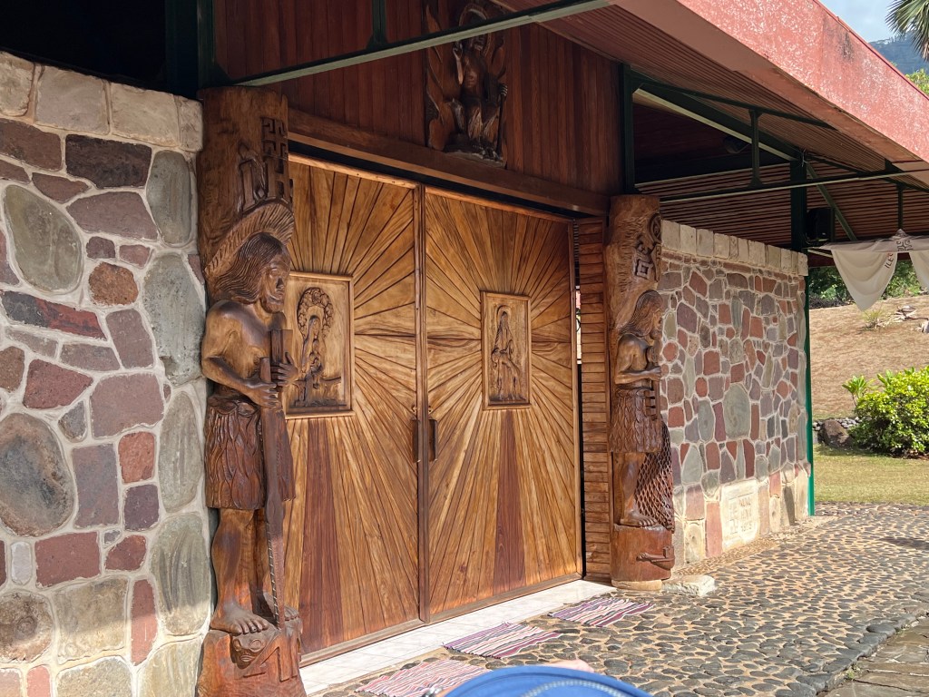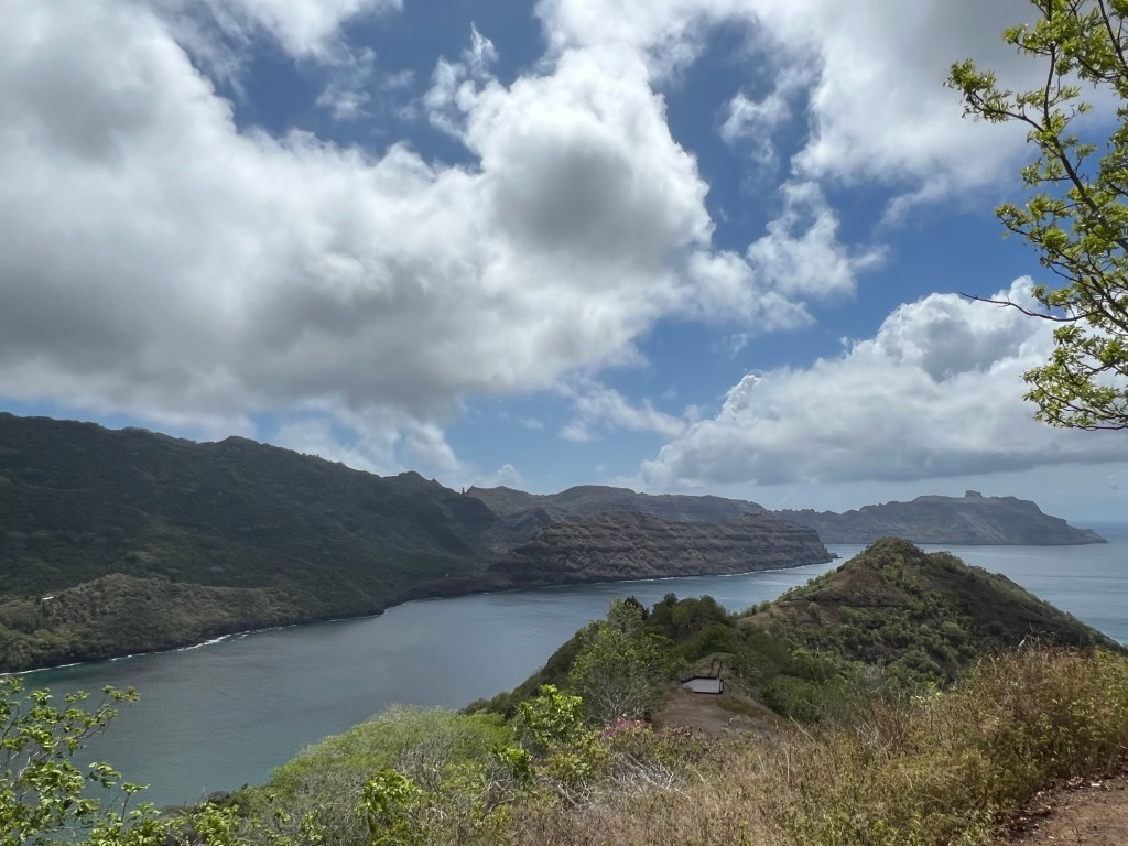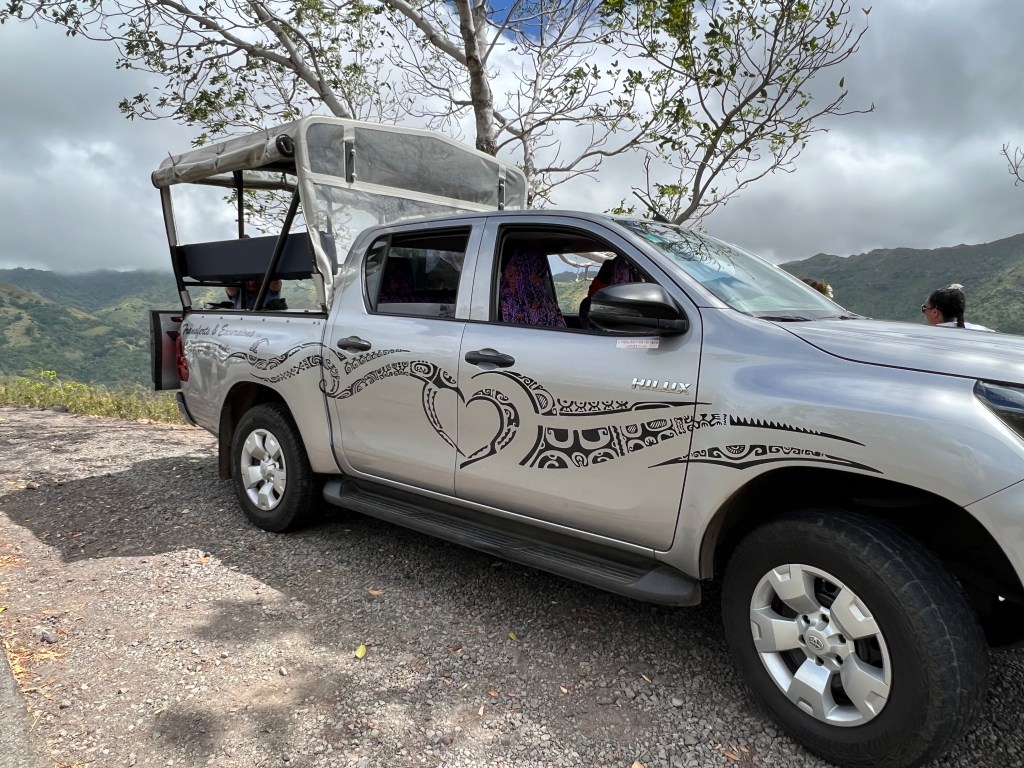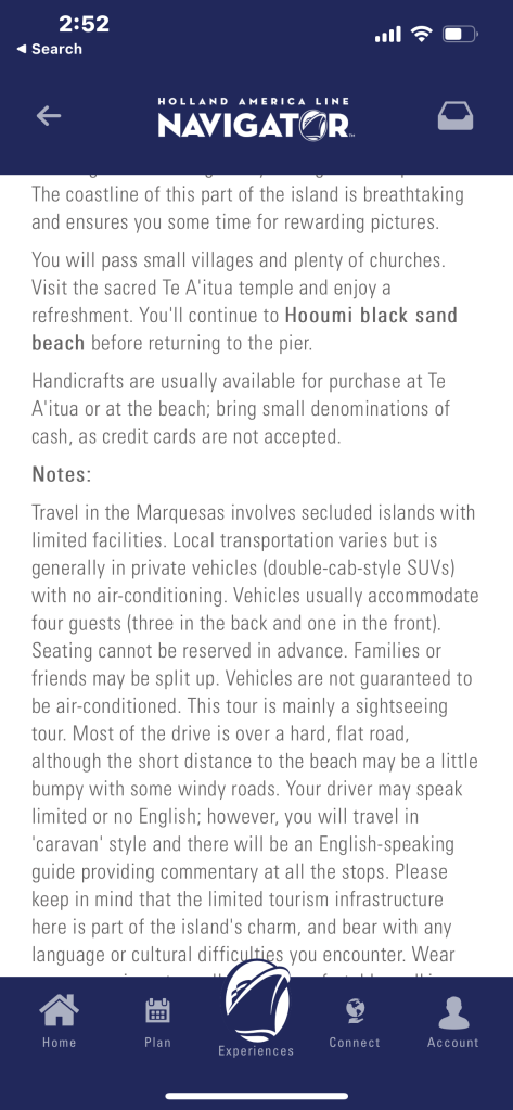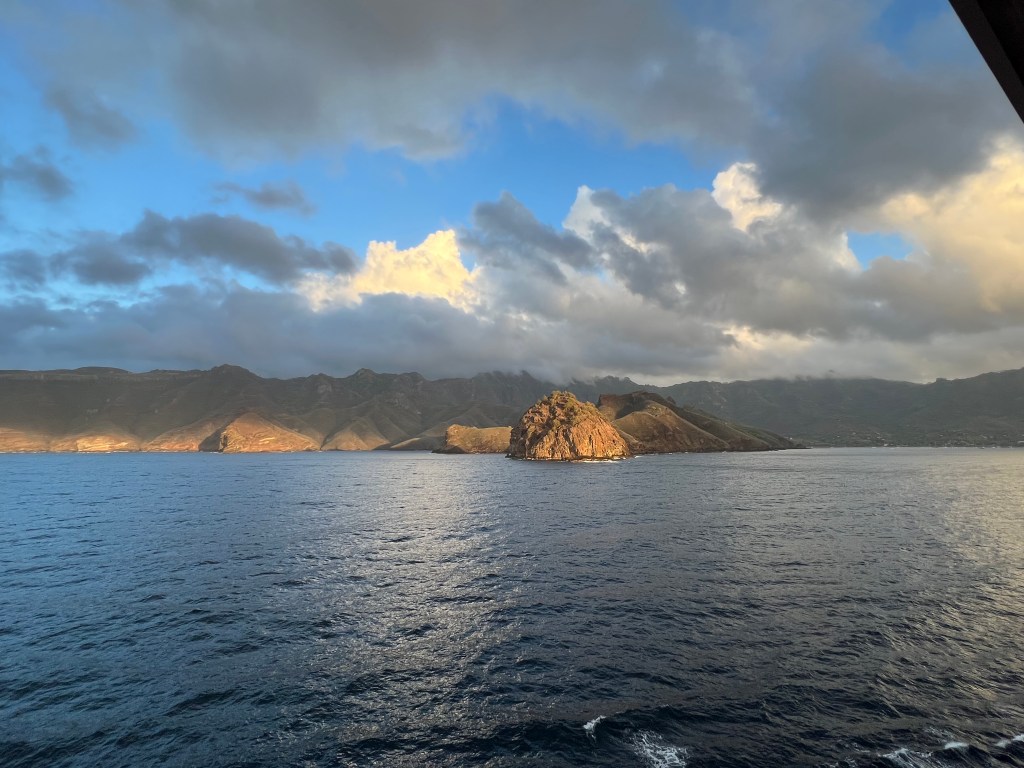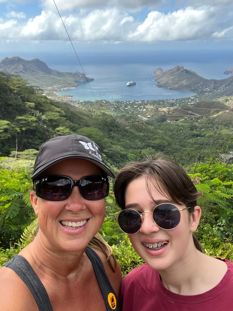 There is land outside my window. I haven’t seen land in eight days and there it is coming into view. I was awake at 5:00am this morning and went out on my patio. I watched the sunrise to the east and Nuku Hiva, Marquesas approach from the west. There was even a rainbow to greet us as we approached the island. Megan and I grabbed a quick breakfast in the Lido from the buffet. It started to rain while we were eating so we headed back to our cabin to quickly grab our raincoat and our COVID cards as recommended by the cruise director. Better safe than sorry. Today was a tender port so we had to report to the theater and await our excursion group to get called so all the people in our group could be in the same tender boat. Today’s excursion was the one and only we had to choose from. We took a scenic drive around the island. We got to see a lot of amazing blooming flowers, black sand beaches and panoramic views of the ship and the bay from high atop the mountain. We visited two villages and saw where they are recreated some historic sites in a place more easily reached by tourists. We saw many bread fruit tress, a staple of the diet here, and many coconut groves as coconuts are a large exported item from the island. We also got to sample some local fruit and dried breadfruit. Which I actually fell I love with at a roadside stand in Tonga in 2020. I was very happy to have it again and purchased a bag of it to bring back to the ship for me and a bag for our amazing server Jenny who waits on us most morning int he Pinnacle grill. She loves salty food like I do and they will definitely feed her cravings too. There were lots of local inhabitants selling locally made crafts and jewelry as well. Megan got a carved Nuku Hiva key chain and I picked up a beautiful Lei for only three dollars! I wore it all day and it is currently in our cabin and it smells heavenly in here. The way they transport you around here is in a pickup truck that accommodates four people inside and then some have additional seating in the bed of the truck. Megan got an outside seat and I got to ride shotgun in the truck. There are no air conditioners in the vehicle and it was 80 degrees today. Oh, and the driver doesn’t speak English as French is the primary language on the island as well as Marquesas. So there were about 15 trucks in our group and at each predesignated stop there was a lovely woman, Anne, we gave it information on the place we were visiting and what we were seeing. Our driver had an auspicious cough so I took one for team Merson riding the cab, window down and I was double masked every time we got int he vehicle. Which wasn’t easy in the heat. Megan owes me for this one. We decided it was best to stay safe and healthy. We stopped but the local farmers market right at the pier before boarding back in the tender boat to head back to the ship. Megan got four Mangoes and I got a giant avocado. Once we were back on the ship we decided to go and have some lunch in the lido. Megan of course brought a Mango and proceeded to devour it in expert fashion as she eats them often at home. She said it was the best Mango she ever had in her whole life. I can’t wait to watch her eat the other three!! Then it was back to the cabin to enjoy the internet that is surprisingly better than I had expected. I got caught up on my backlog of blog posts and downloaded all my photos from toady. It’s hard to decide which ones to share with you but I hope you enjoy them all. I decided to take an evening to myself and ordered a Cobb Salad off the room service menu and watched a movie. Megan went and had dinner with Gail and Marty in the main dining room. The ship hosted a “GLAMP OUT” on the ship last night. A fun play on a camp out with faux campfires, the hotel manager hung out in a canoe in the pool, and there was fun food passed like mini hot dogs, bacon maple donuts and s’mores. Megan had a lovely time. Tomorrow is another sea day and we will get a chance to resume some of our regular activities that we didn’t get to do today. Ship life is a fun balance and we are having a delightful time. Hugs to you all.