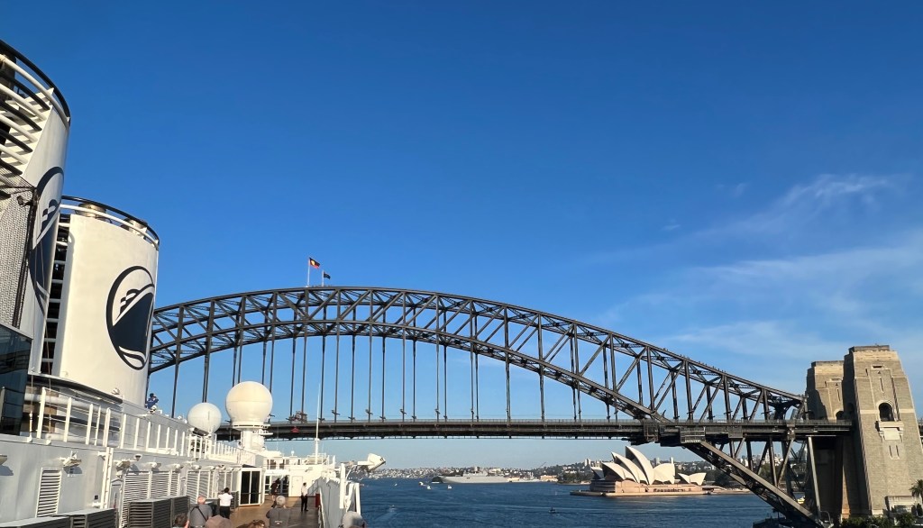 It’s always nice to have a change in things by having an overnight in a port. An opportunity to go to sleep in one place and wake up still in the same place. It doesn’t happen very much on the world cruise, so it is a bit of a novelty. Megan and I took great delight in sleep in this morning. I woke up early. but was able to go back to sleep. We finally woke up and started our day around 9:00am. By 9:30 we were ready to leave the cabin and start our day. We grabbed breakfast at the Lido this morning and then off the ship we went. No immigration inspection this morning as we were all cleared yesterday. We hopped on the shuttle again and headed to the shopping district where we shoppe din 2020. It is actually multiple blocks of multiple storied buildings filled with every shop imaginable. Megan and I each got a new dress from a locally made company, Megan continued her tradition of getting a cool new pair of sneakers while in Sydney (she’s two for two), I got new UGGs (a tradition for me now too), and I bought my granddaughter a pair of adorable UGGs as well. Megan found some more Dr. Pepper in flavors we had not seen or tried before, vanilla float, cream soda, cherry and dark berry. She’s excited to try them. We also ventured into a Mc Donalds and shared an Angus burger, Megan got a strawberry milkshake and we tried a Hokey Pokey Mc Flurry. Sometimes you just need something that taste like home. LOL!! It was a hot and humid day so around 2pm we decided it was time to head home. Back on the ship we cooled down, got all our goodies put away from the last couple of days. and fought every desire I had to lie down and take a nap. We had dinner at 5:00pm and then went up to the aft deck for a sail away party. We have to make sure we leave at low tide because the ship can barely fit under the bridge and only under the perfect circumstances. This was a breathtaking experience leaving Sydney. Going under the bridge, sailing through the harbor and past the Opera House. We got to see a group of climbers on the top of the bridge and we cheered up and they cheered back down as we sailed right under them It was all an opportunity not to be missed when it is here to be had. It did not disappoint. There are more photos in the phone than I care to admit, but I have no regrets for having the memories to look back on forever. We shared our evening on the deck mingling with a lot of the crew and our friends Freddy and Bob. It was a wonderful way to end our time here in Sydney. The sun, the breeze blowing, I pray I never forget this exact moment in time. I am blessed to be able to immortalize it in this blog for you and for me to have it to look back on in the future. Thank you for coming along on my adventures with me. Enjoy the photos from today.