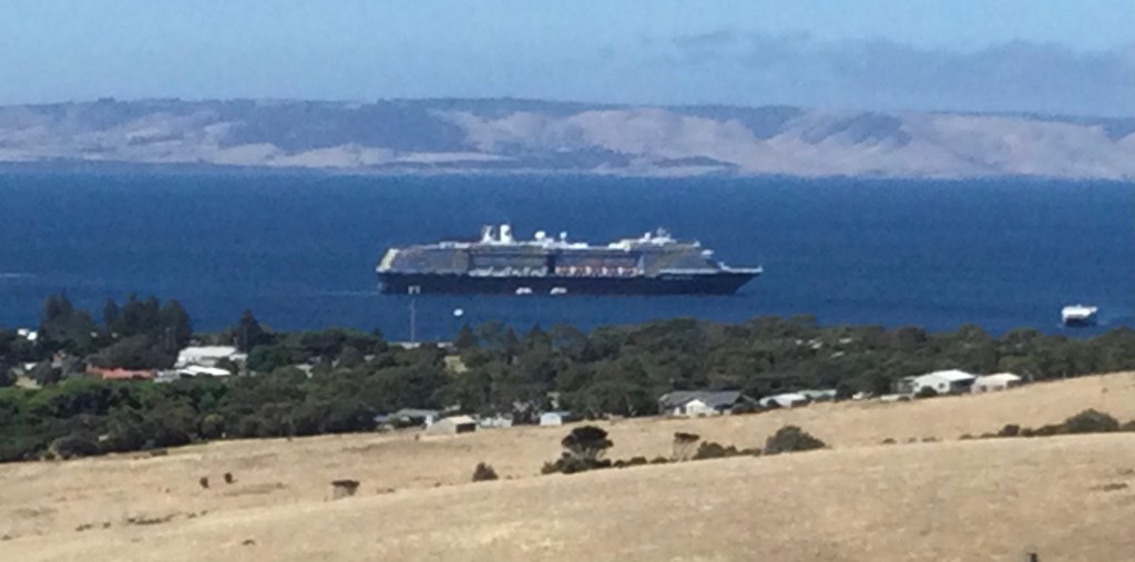 Today was a very long excursion day. Lots of stops, lots of time on the bus, and a full day getting to see all around Kangaroo Island. We were up at 7:30 am and grabbed our quick Lido breakfast today. We met our tour group at the Main Stage at 8:45 am. We are a group of about 40 today which is much larger than our group of three from yesterday. We took the tender over to the island and hopped onto two smaller buses and began our adventure. Kangaroo Island has a population of about 4800 people. It has one stop light and it moves around depending on where the road construction is taking place. (Feels like home) People generally come here for holiday via ferry from Hobart. When one of the larger ships come into port, the island population doubles. All water mammals are protected here. There is a $50,000-$100,000 fine for killing an animal here. We stopped first at the Pennington Bay lookout to get a fantastic view and some scenic photos. Next, we went to Emu Ridge eucalyptus oil distillery. The family has owned this distillery for generations and they are still making oil they way they have for almost a hundred years. They had an emu and a couple of young kangaroo’s on the property as well. We also got to try four types of Colony Cove apple cider that is brewed on Kangaroo Island. Our next stop was the Emu Bay Lavender company. We learned a little bit about their fields. They produced two types of lavender there. One is edible and the other is use for the essential oils. We were also served a nice sandwich and a lavender scone with lavender jelly and clotted cream for dessert. Next, we ventured to the Island Beehive honey company. The oldest honey producer in the world. Kangaroo Island is extremely protective of what they import onto the island to protect this precious buzzing commodity. If we are caught taking anything off the ship that is not allowed (basically only water) you can loose your passport and be issued a $5,000 fine. We got to sample three types of honey produced here and honey ice cream. It was kinda of a food fest day. Our next stop was in the town of Kingscote where we were given an hour to shop and relax on our own. Megan and I bought postcards and stamps from the local gift shop and had a bit of a snafu trying to find the post office. Luckily the lady at the shop we popped into for a homemade pizza and another cider, agreed to drop our cards in the post for us so we could run back to the bus and make it on time. Next, we stopped at another scenic overlook where we got a great photo of our floating home out in the bay. When we tried to leave there, our bus decided it wasn’t ready to go to the next stop. There was an issue with the door of the bus and it would not allow the driver to use the accelerator. So bus #1 took their passengers to tout next stop for wine tasting at The Shy Wren tasting room and then came back and picked us up and delivered us to the wine tasting as well. By the time we were done with the tasting a second bus had arrived to transport us all back to the pier to catch our tender back to the ship. It was a long day, just over 8 hours. My back is not happy after sitting all day. I go back to the acupuncturist tomorrow. Today was the first day in a week I did not need a Motrin to make it through the day. But I will probably take one to get me through the night. Fun facts about the Australian flag. It has both an Emu and a Kangaroo on it. Australians consider Kangaroo to be a bit of pest animal. They are actually raised here for meat. But those two animals are on the flag because they can not move backwards. Australian wanted to use them as a symbol of forward progress, ie always moving forward and never backwards. So there is your lesson for today. You’re Welcome. Since we did not make it back onto the ship in time for our 5:00pm seating in the main dining room, we opted for a more casual dinner in the Lido this evening. After eating all day neither of us were very hungry anyway. After dinner we came home to do a little cleaning up. Megan cracked open her jar of honey we bought today and thoroughly enjoyed some. She loves honey. Sweet Dreams to all my sleeping friends and family. Tonight we set the clocks back another .5 hours again. Making it now a straight 6 hours difference between us and CA. Yea!! Makes the mental math so much easier. Hugs and Love from across the sea!