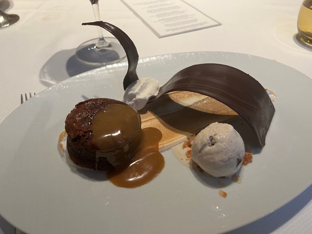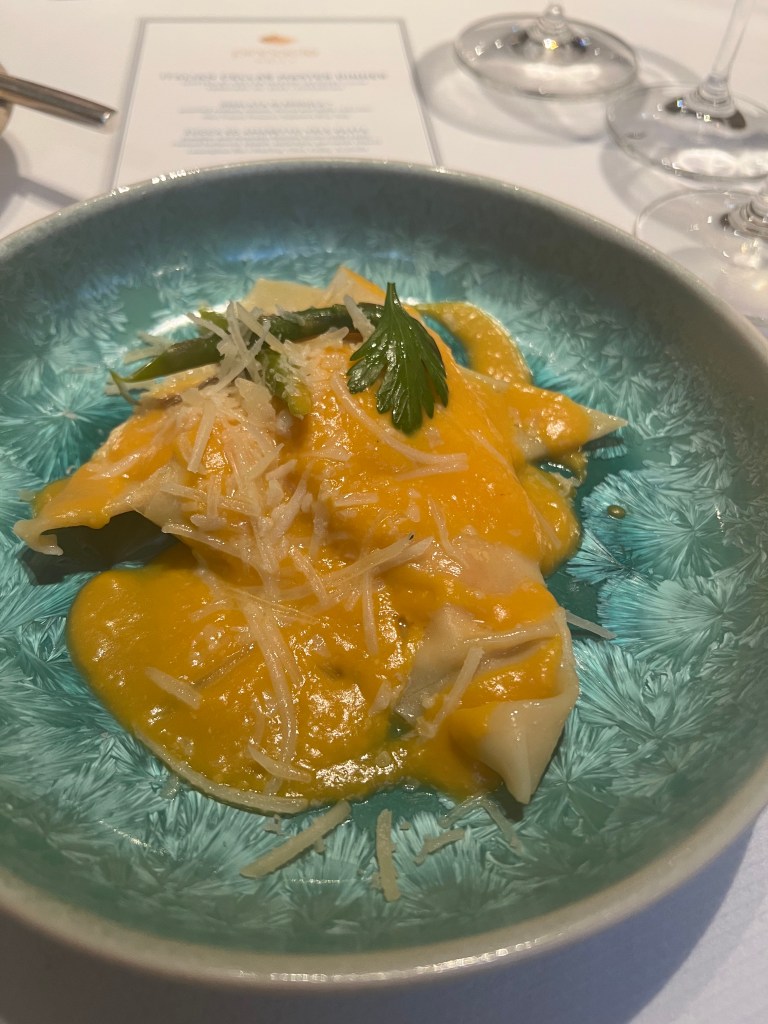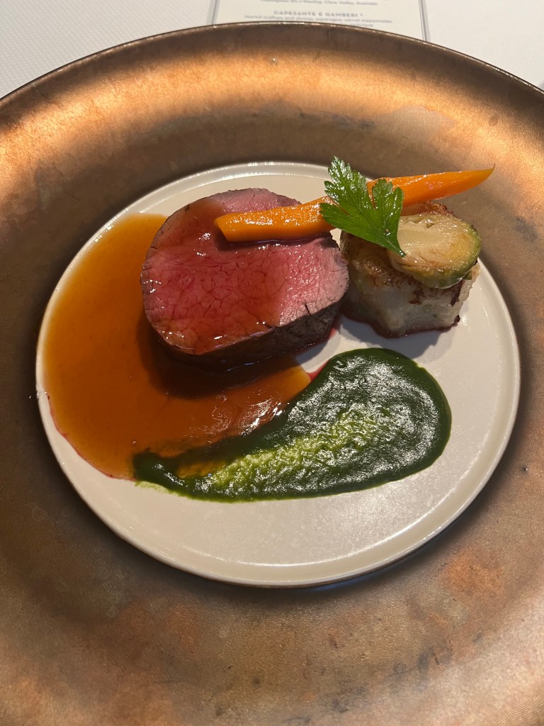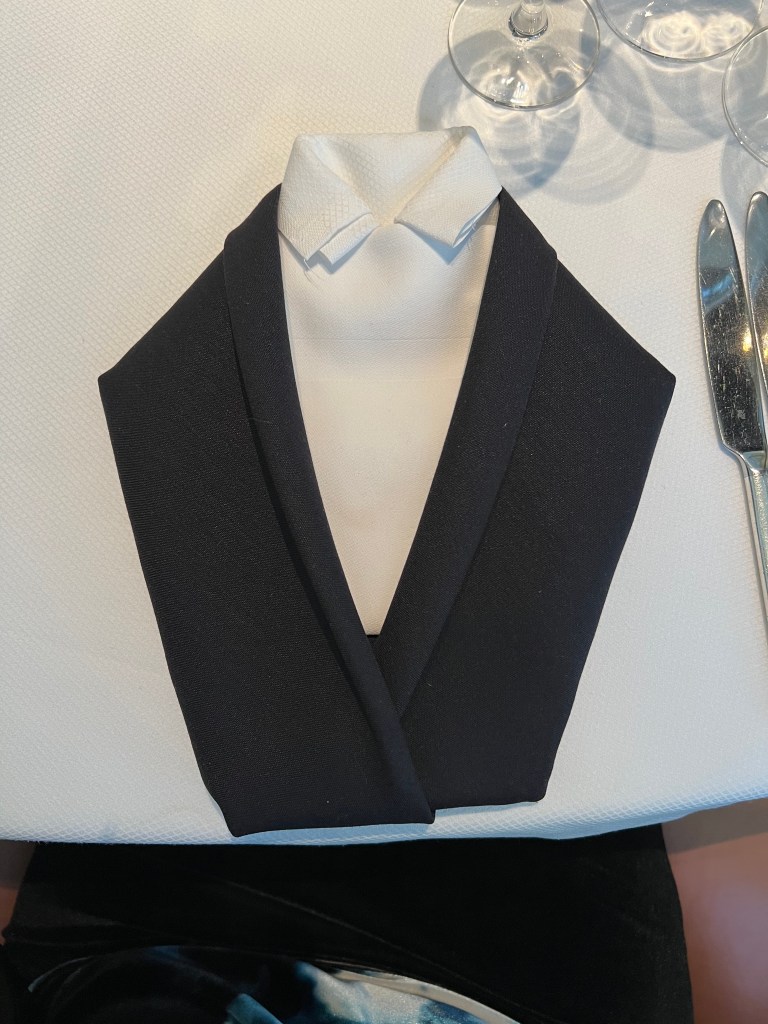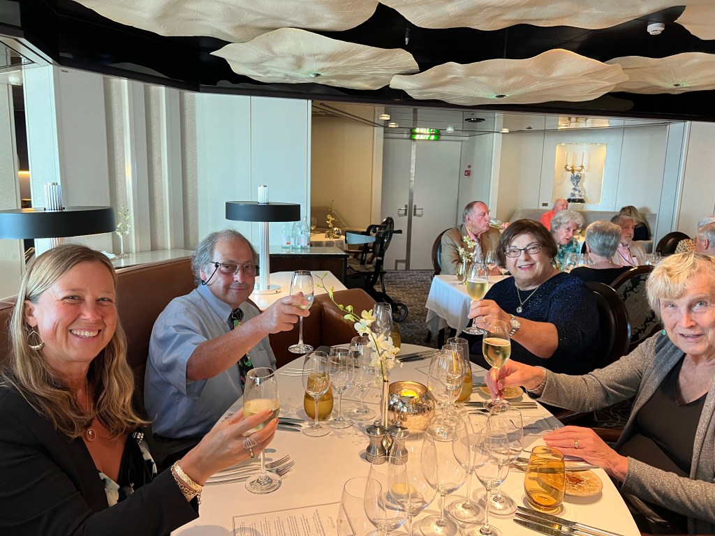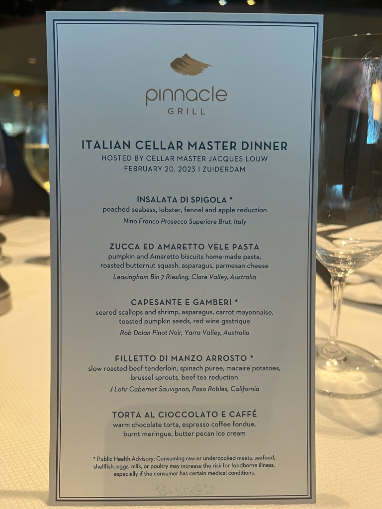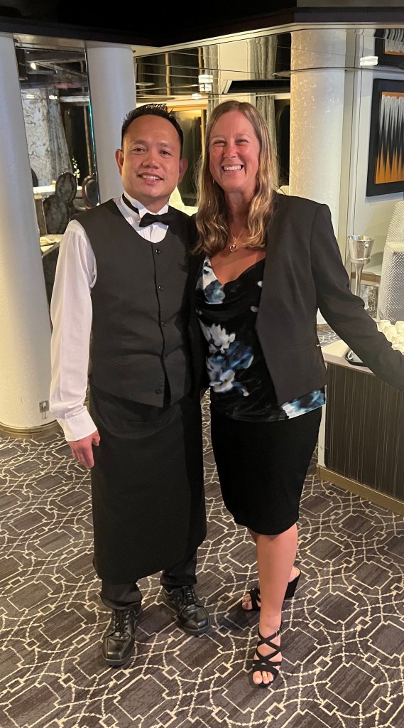 It’s another sea day and I have learned we have crossed the imaginary line that now puts us in the Indian Ocean. We are still en route to Fremantle, Australia. Last night we got an invitation to a gathering today at 2:00pm for those of us currently on the ship from the 2020 World Cruise. You can sense a weirdness among the passengers as we approach the place where our 2020 World Cruise ended traumatically and abruptly. We tried to sleep in this morning, not very successfully. I was up and ready to go to breakfast when the Pinnacle Grill opened at 8:00am only to discover it was still only 7:00am. So I went and had some tea and waited and let Megan sleep in. I am happy to report my back in still feeling a bit better yet today I would say I am about 50% back to my mobility and normal activity. Still a way to go, but I will take it!! I had breakfast and then went to Project Linus this morning. I am making great work of my blanket thanks to my back feeling better. We headed back to the cabin after PL and Megan had tutoring at 12:30pm and I took care of some business/ my honey do list, that I had planned to tackle today. We will have two port days coming up and I wanted to put some things off my mind. I got to see Beh, one of our amazing regular servers in the Pinnacle Grill, this morning as well as this evening for a special Italian winemakers dinner I went to. Beh is sadly getting off the ship the day after tomorrow so today was our chance to say good bye.