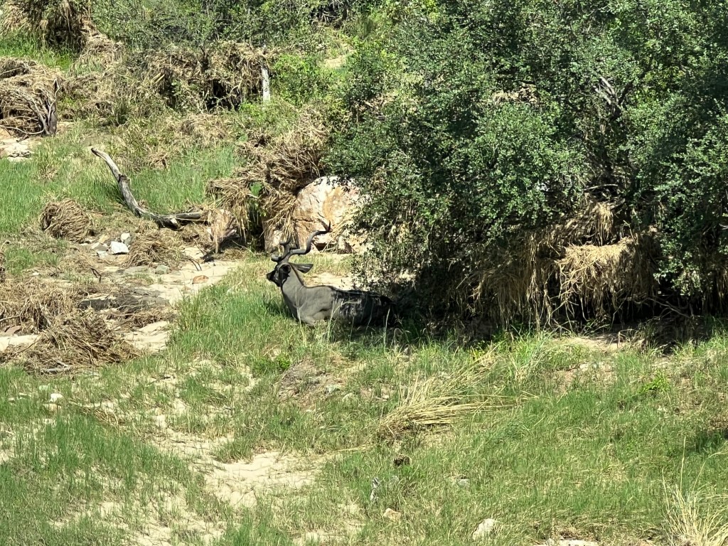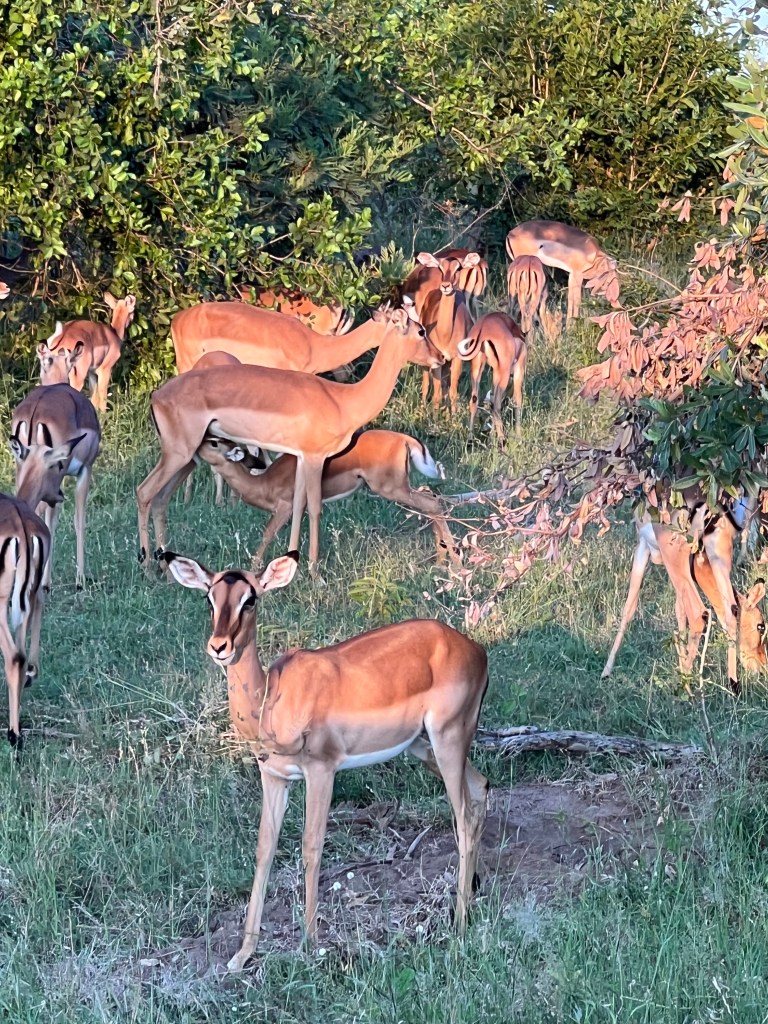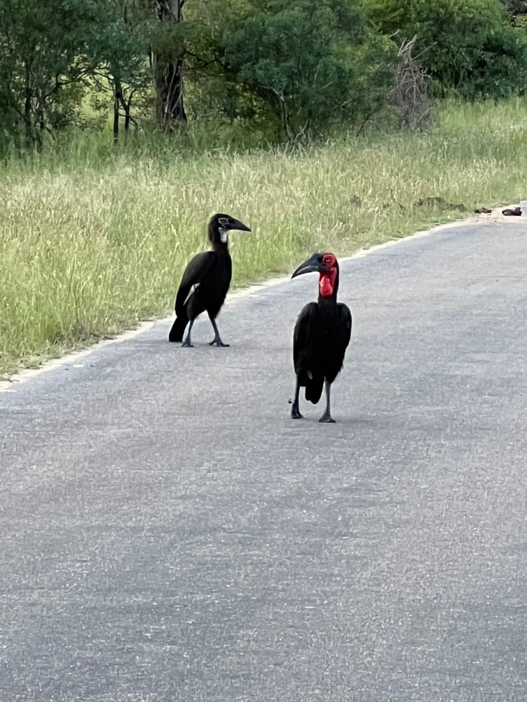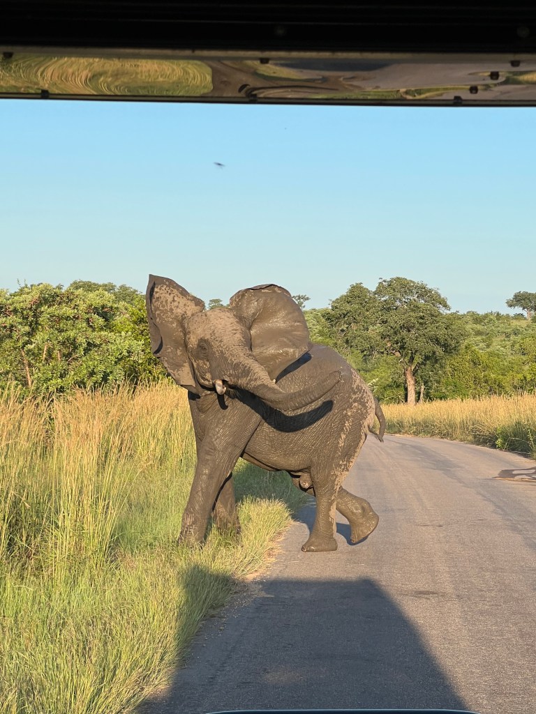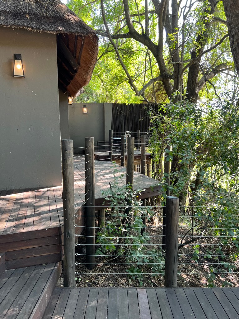 Before I even got out of bed this morning I smelled fire. I went outside on the balcony and the smell was even stronger. I watched the sun rise in the East as the full moon was setting in the west. It was an amazing sight to see. Last night we preordered room service for the first time. We were able to eat breakfast in our cabin while we finished getting up and ready for the Safari. Around 8:00am we headed to the Rolling Stone Lounge and waited for immigration to finish clearing us so we could get our passports back before getting off the ship. We loaded up into two separate vans to accommodate our group of 25. Our van had a trailer behind it with all our luggage in it. We had to drive about three hours to Kruger. We passed through three toll booths and paid a toll, but there are no EZ Pass lanes. Along our drive we saw hundreds of trucks hauling iron ore, coal and raw chrome to the port for export to China. Sadly, the driver told us there is not enough coal here to power the country, yet they export so much to other countries. They actually have mandatory power shut offs three times a day lasting a minimum of two hours each. Around 11:00 we came to the Mozambique/South Africa border. We had to get off the bus and get into line for passport inspection. We got stamped and got back into the bus. About a mile up the road we repeated the process again as we needed to go through immigration to get into South Africa. Quite a long process. But with the kindness and expertise of our driver we got through very smoothly. Ahhh. But did we? Unfortunately our HAL escort got stopped at the South African border. She did not have a visa and we had to leave her there. After an hour of failed negotiations, they are making transportation arrangements to get her back to the ship and we ventured forward. We stopped to pick up pre-boxed lunches and continued on and ate lunch in our bus. We were stopped three times along our drive by police offers looking for people not traveling with proper papers. We saw lots of agricultural land papayas, mango, banana, lemons and sugar which they use to make gin. As we crossed the bridge at Crocodile River just before entering the gates at Kruger Park, we saw crocodiles, impalas and hippopotamuses and we weren’t even in the park yet. We arrived at the Jock Safari house and were warmly greeting by so many staff that work here. We were given a quick tour of the property and then we were escorted to the dining hall where there was food and drinks waiting for us. There is a small community pool, two swinging chairs, and a beautiful view of the river below. There is an electrical fence surrounding the entire compound and security 24/7 to protect us. The lodge is so beautiful. We were given a quick talk on the itinerary, meeting times and places for the rest of the day. Next, we were escort to our suite where our luggage was already waiting for us. We have our own little piece of paradise right here in Africa. We have a small private plunge pool on our giant patio, an outdoor shower and an outdoor bathtub and a large screened in enclosure with a day bed. Inside our room is all the amenities you could need. Coffee maker and fridge a king size bed with mosquito netting, a huge double headed shower and two sinks. We also have a small sitting area. There was a lovely letter welcoming us to the lodge. We feel so pampered. There are 25 guests here and I think there are as many, if not more, employees as there is guests. We were given about 90 minutes to get settled in. We dipped our feet in the pool and took in the amazing view from our deck. Then it was time to get ready for our first game animal drive. We met up with our group and our Ranger Lazarus who will be our driver and guide for the duration of our stay here. He has worked in Kroger National Park for twenty one years. At 4:30 we were separated into four jeeps and away we went!