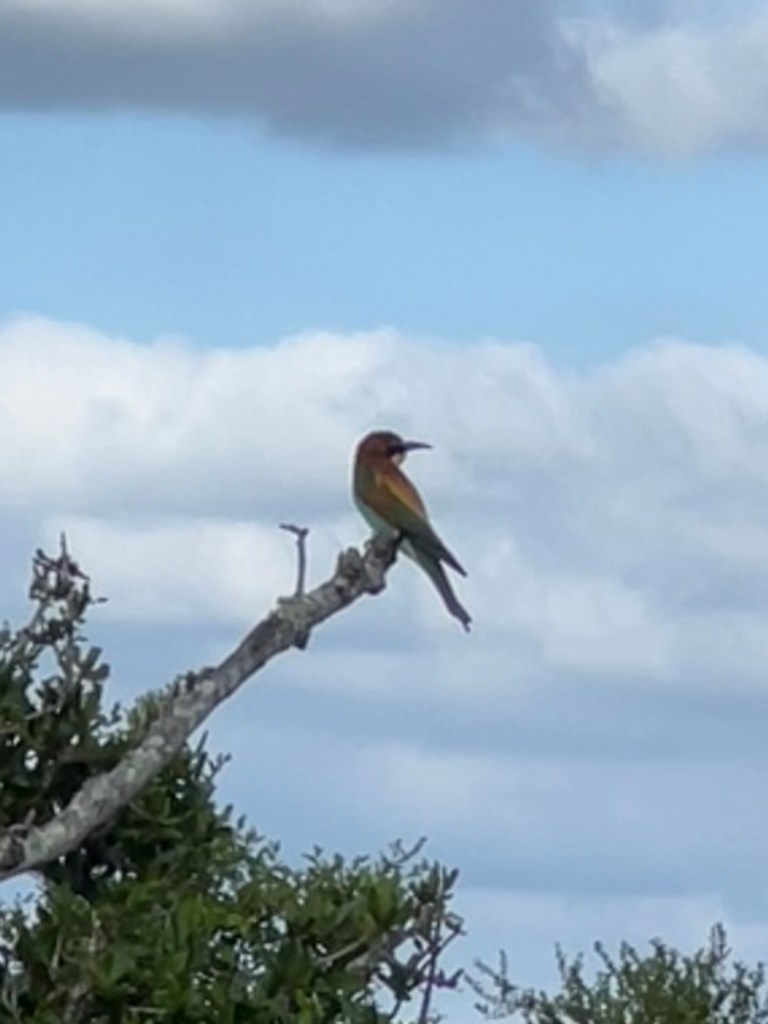 Animals Seen Today: African Fish Eagle (Similar DNA to a bald eagle), Brown Headed Parrot, Elephants, Wildebeest, Spotted Hyena, Leopard, Wart Hog, Water Buck (white circle on their butts), African Tree Squirrel, Lions, Zebra, Giraffe, Ground Hornbill, Hornbill, Rhinoceros, Turtle, Impala, Gray Dagger, Crocodile, Ververt Monkey, Cape Starling, European Bee Eater, Lilac Breasted Roller, War Breast Eagle, Red Crested Cormorant, White Rhinoceros, Swensen Franklin Fowl, Ostrich, Cape Buffalo, Golden Orb Web Spider, Spotted Eagle Owl, and Lightening Bugs!