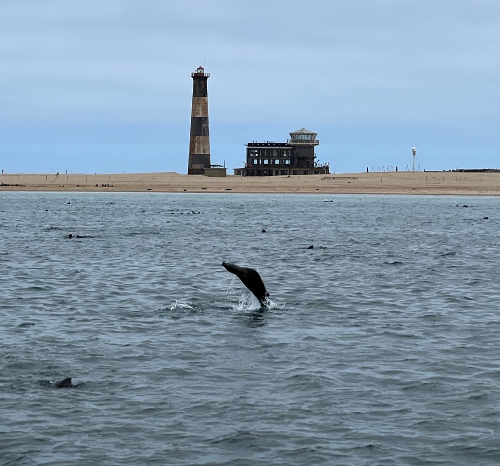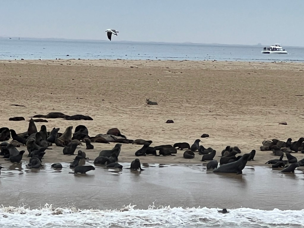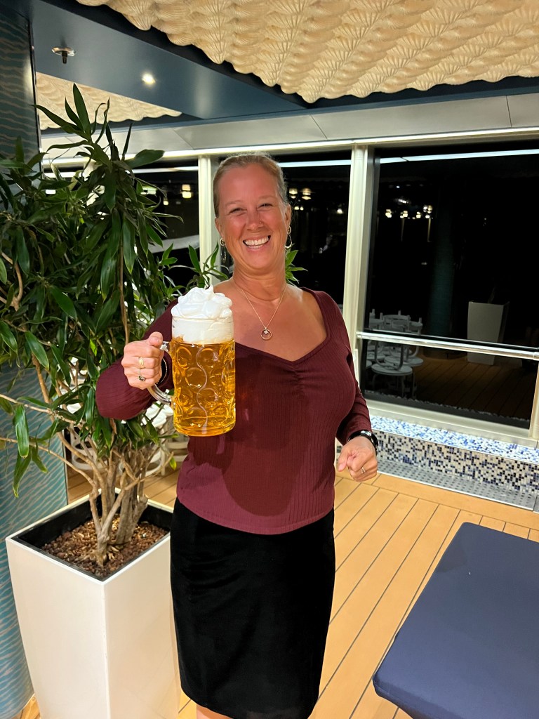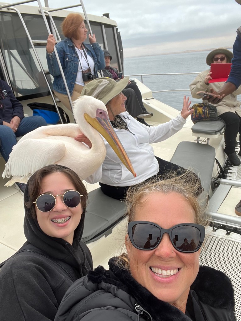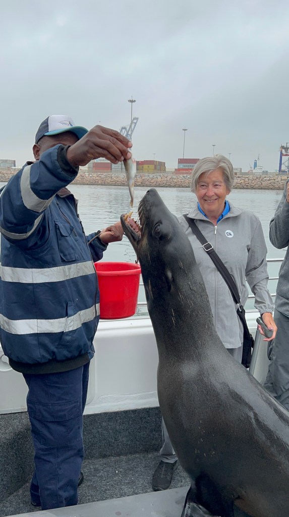 This morning we awoke as we were pulling into Walvis Bay. It is cloudy and overcast so we will have to make sure we dress warmly for our excursion today. I woke up about 6:30 am and went to the gym. Megan met me at the Pinnacle Grill and we had a lovely breakfast together. After breakfast we decided to see if we could switch our excursion from an afternoon to the morning one and we were. So we had a quick change and bundled up so we could head off the ship in time to meet our group. We walked up the pier to meet our transport that took us right around the way to the Walvis Bay Yacht Club. We hopped onto a boat for a scenic cruise around the Walvis Bay. We started our day on the speed boat, but they decided that the two boats weren’t balanced enough in the numbers so Megan and I volunteered for and got to do a mid trip transfer to the catamaran. Good to be young and healthy. We got to see many Cape Brown Seals, Molamola fish, Pelicans and Heaviside Dolphin. The seal colony was absolutely humongous. This time of year the younger seals are learning to swim and getting ready to venture off on their own. And there was a lot of them. We also got to see an oyster farm floating off the shores. They use floating barrels to mark the oyster nets below. We experienced a wonderful level of hospitality on the ship. They brought a seal onto the ship and we had the opportunity to feed it. They also brought a pelican on board and we had the opportunity to take many photos with it. Megan even had the chance to feed the pelican and received a bit of a nip as a souvenir. They provided us with an early morning drink called Old Brown, a sort of sweet wine. They served us beer, water and sodas later on. Lastly, they served us food and champagne. We got to eat freshly shucked oysters, empanadas, and meatballs. Once we got back to the pier we contemplated taking the shuttle into town to go to the mall but we decided not to. Instead we enjoyed an early all aboard and got a chance to be on the ship when there was still many passengers on their excursions. We got to go to the Lido deck and spend some time with the children that came on board from the Bernhard Nordkamp Centre. This is after school program run by volunteers for unprivileged children. In 2013, when the world cruise was here, the children came on board and performed for the passengers as they did again this afternoon. Many of those children who are now grown up returned for the opportunity to perform again as well as new younger students who are currently enrolled in the school. They were like little kids in the candy store this afternoon. They were allowed to use the pool and eat at the buffet. We saw many a large bowl of ice cream in front of many smiling faces. The silent auction the ship had yesterday was to make a donation to this group. They also had a collection box for passengers to make cash donations. At the conclusion of their performance that Captain presented to them a check of close to $10,000 from the funds raised. They also sent the group off with 41 bags filled with necessities and school supplies also donated by passengers. It was a wonderful service opportunity and an amazing opportunity to make a huge difference in the lives of so many children so far from home. After the performance we had to go through immigration inspection a second time so we could get “stamped out” of Namibia. Tonight we had dinner with Gail and Marty in the Pinnacle Grill. Another wonder meal, fabulous conversation and even better company. I always enjoy our dinners with them so much. After dinner we headed up to the lido deck as they had a Biergarten Festival this evening. They had German-Styled beer, music and food. They were super creative in making large beer steins we think were filled with jello and topped with meringue to represent foaming beers. We had fun taking those photos. We stayed out till about 10:00pm when the music ended. Then we were home and into bed right after. We have two sea days ahead of now to rest and relax and catch up with all our friends.