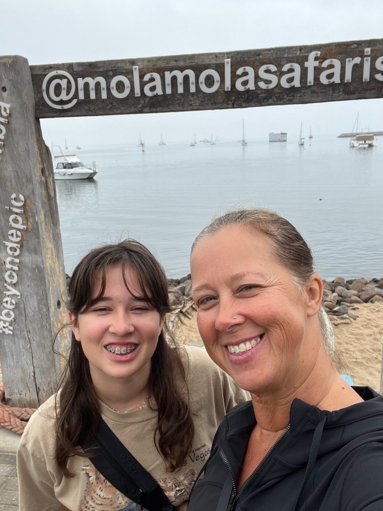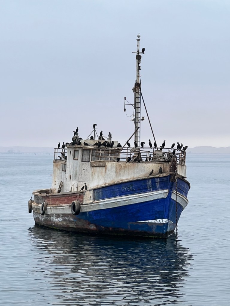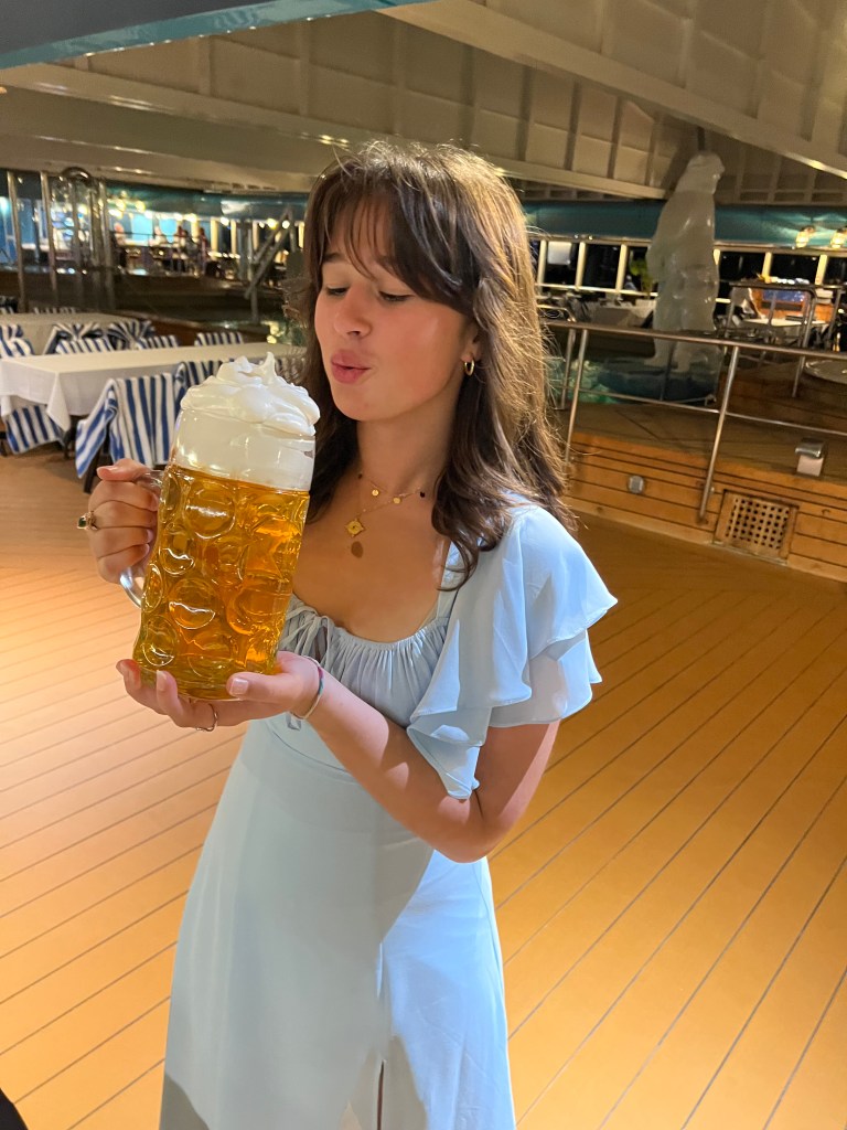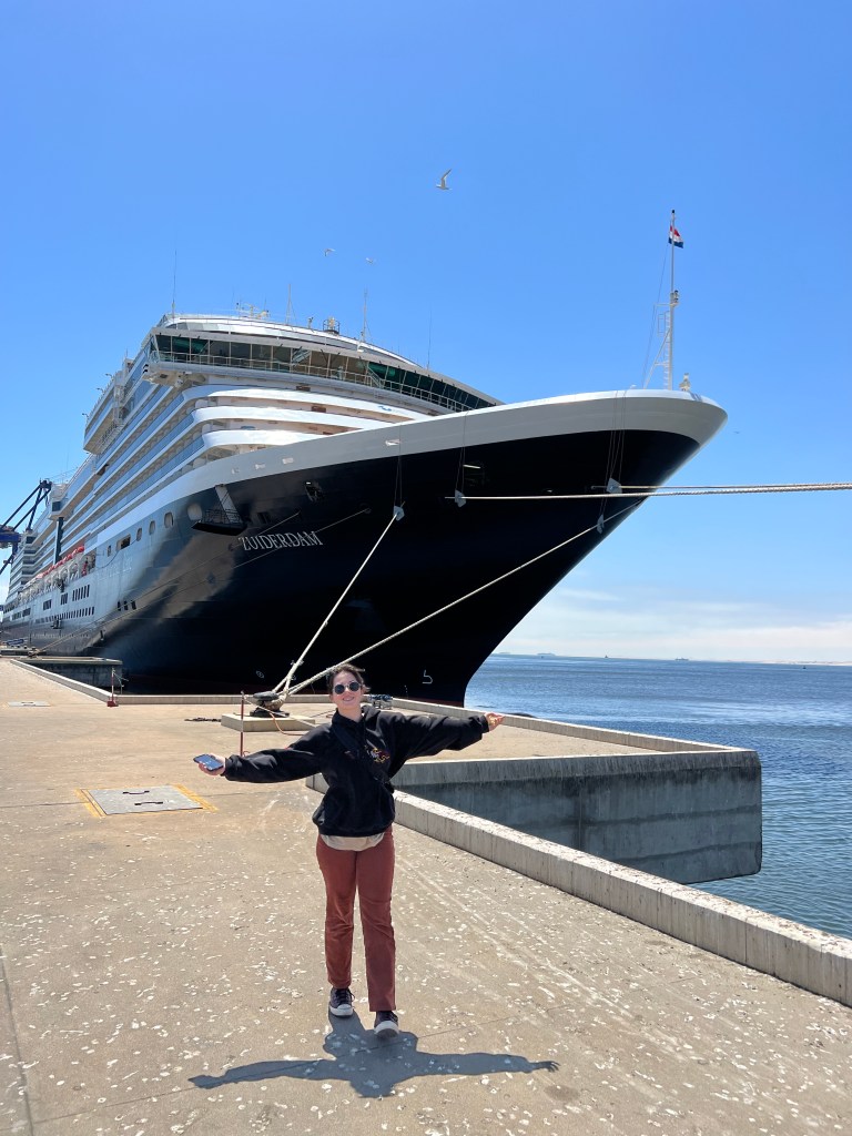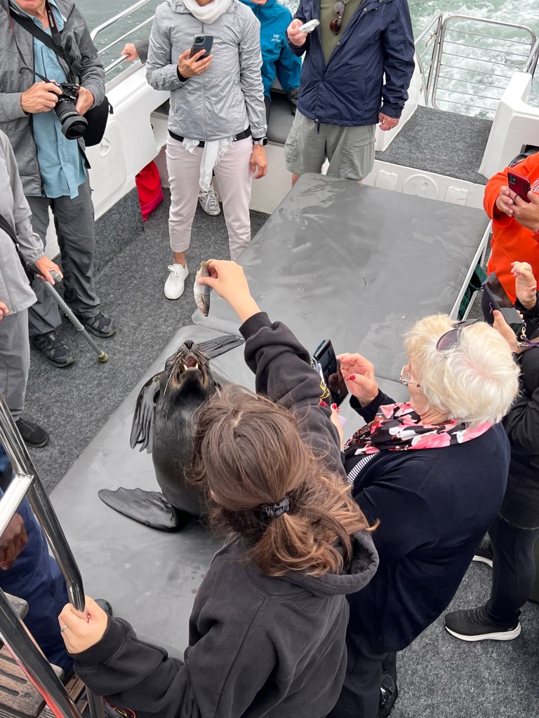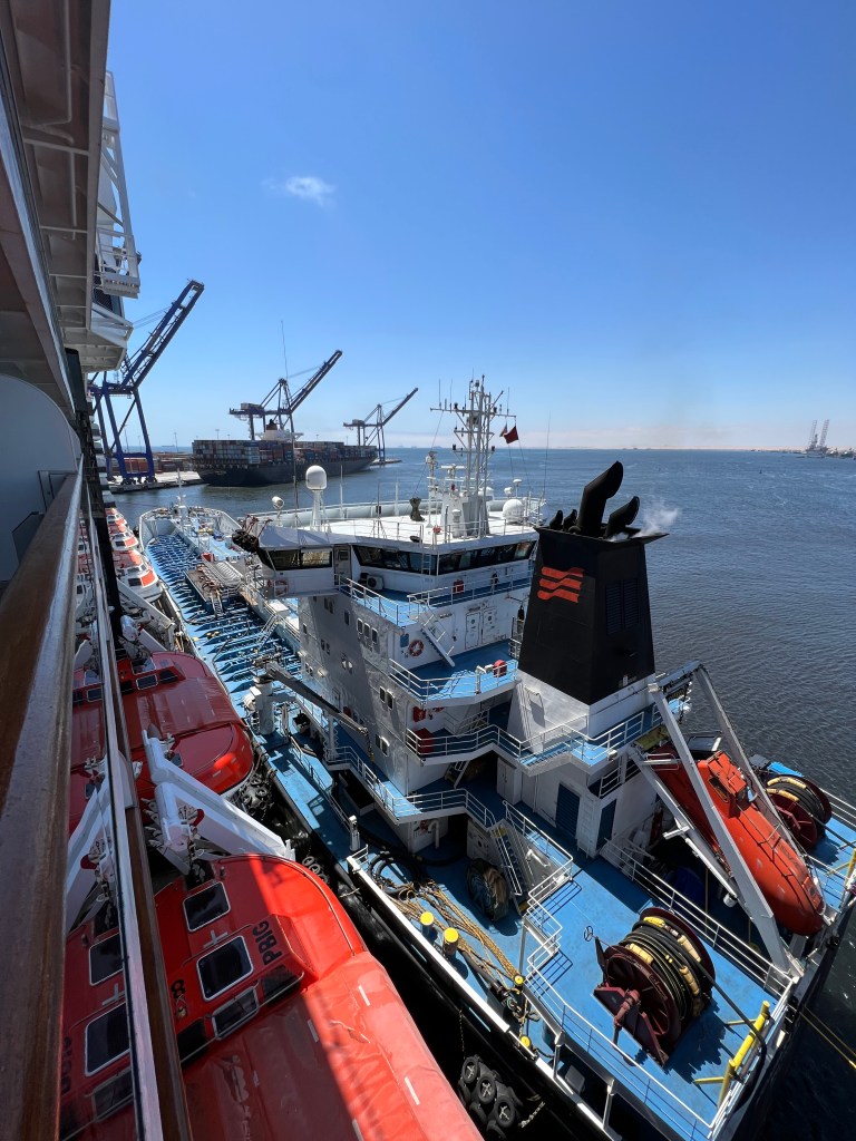 This morning we awoke as we were pulling into Walvis Bay. It is cloudy and overcast so we will have to make sure we dress warmly for our excursion today. I woke up about 6:30 am and went to the gym. Megan met me at the Pinnacle Grill and we had a lovely breakfast together. After breakfast we decided to see if we could switch our excursion from an afternoon to the morning one and we were. So we had a quick change and bundled up so we could head off the ship in time to meet our group. We walked up the pier to meet our transport that took us right around the way to the Walvis Bay Yacht Club. We hopped onto a boat for a scenic cruise around the Walvis Bay. We started our day on the speed boat, but they decided that the two boats weren’t balanced enough in the numbers so Megan and I volunteered for and got to do a mid trip transfer to the catamaran. Good to be young and healthy. We got to see many Cape Brown Seals, Molamola fish, Pelicans and Heaviside Dolphin. The seal colony was absolutely humongous. This time of year the younger seals are learning to swim and getting ready to venture off on their own. And there was a lot of them. We also got to see an oyster farm floating off the shores. They use floating barrels to mark the oyster nets below. We experienced a wonderful level of hospitality on the ship. They brought a seal onto the ship and we had the opportunity to feed it. They also brought a pelican on board and we had the opportunity to take many photos with it. Megan even had the chance to feed the pelican and received a bit of a nip as a souvenir. They provided us with an early morning drink called Old Brown, a sort of sweet wine. They served us beer, water and sodas later on. Lastly, they served us food and champagne. We got to eat freshly shucked oysters, empanadas, and meatballs. Once we got back to the pier we contemplated taking the shuttle into town to go to the mall but we decided not to. Instead we enjoyed an early all aboard and got a chance to be on the ship when there was still many passengers on their excursions. We got to go to the Lido deck and spend some time with the children that came on board from the Bernhard Nordkamp Centre. This is after school program run by volunteers for unprivileged children. In 2013, when the world cruise was here, the children came on board and performed for the passengers as they did again this afternoon. Many of those children who are now grown up returned for the opportunity to perform again as well as new younger students who are currently enrolled in the school. They were like little kids in the candy store this afternoon. They were allowed to use the pool and eat at the buffet. We saw many a large bowl of ice cream in front of many smiling faces. The silent auction the ship had yesterday was to make a donation to this group. They also had a collection box for passengers to make cash donations. At the conclusion of their performance that Captain presented to them a check of close to $10,000 from the funds raised. They also sent the group off with 41 bags filled with necessities and school supplies also donated by passengers. It was a wonderful service opportunity and an amazing opportunity to make a huge difference in the lives of so many children so far from home. After the performance we had to go through immigration inspection a second time so we could get “stamped out” of Namibia. Tonight we had dinner with Gail and Marty in the Pinnacle Grill. Another wonder meal, fabulous conversation and even better company. I always enjoy our dinners with them so much. After dinner we headed up to the lido deck as they had a Biergarten Festival this evening. They had German-Styled beer, music and food. They were super creative in making large beer steins we think were filled with jello and topped with meringue to represent foaming beers. We had fun taking those photos. We stayed out till about 10:00pm when the music ended. Then we were home and into bed right after. We have two sea days ahead of now to rest and relax and catch up with all our friends.