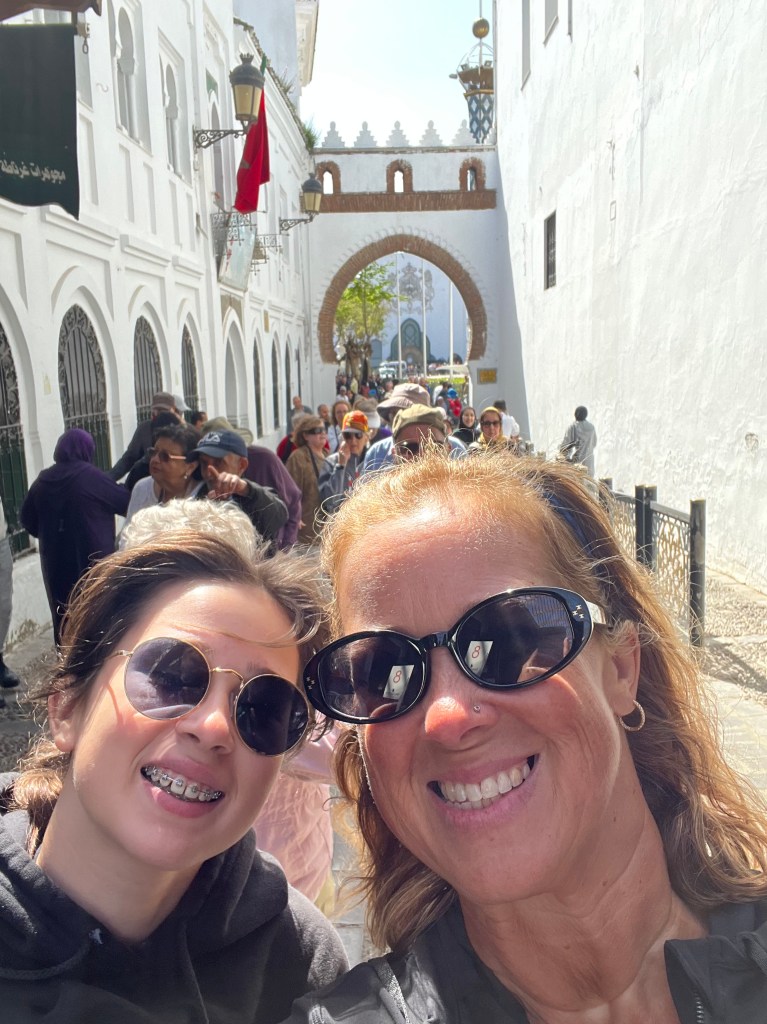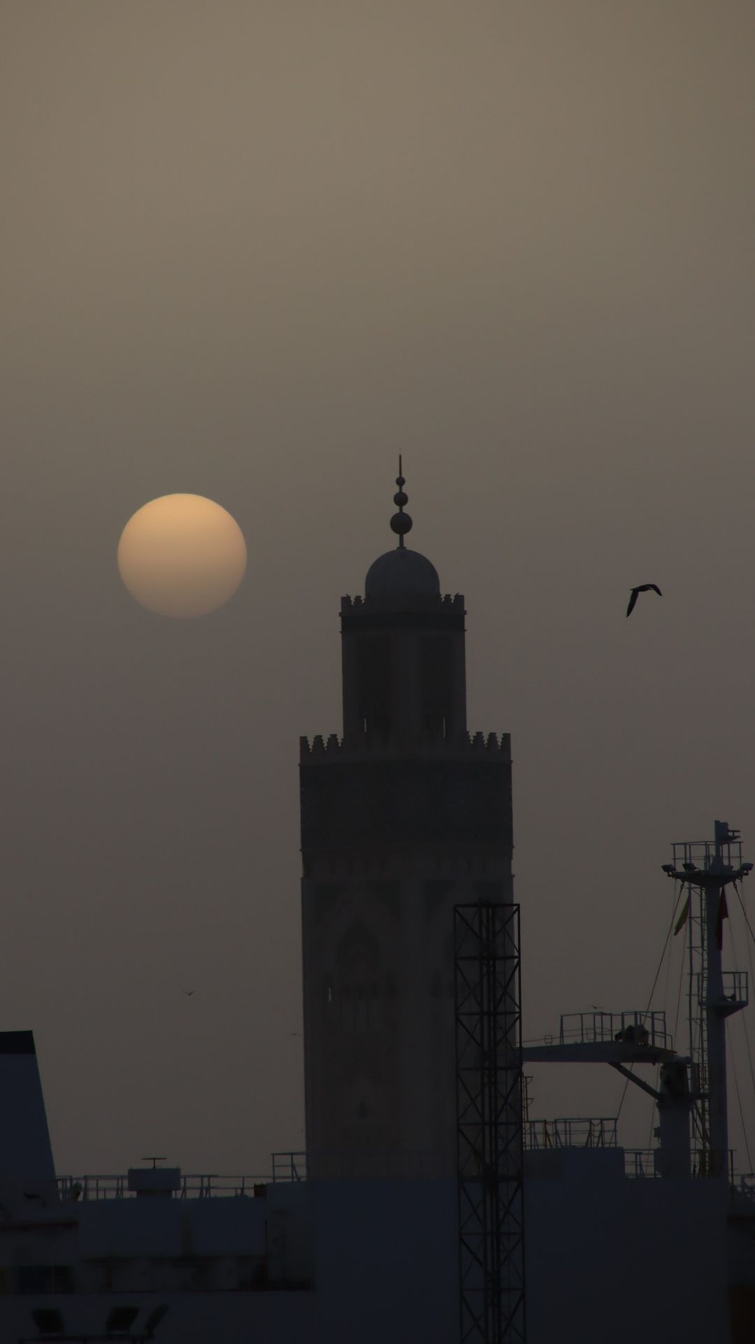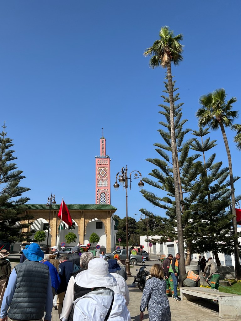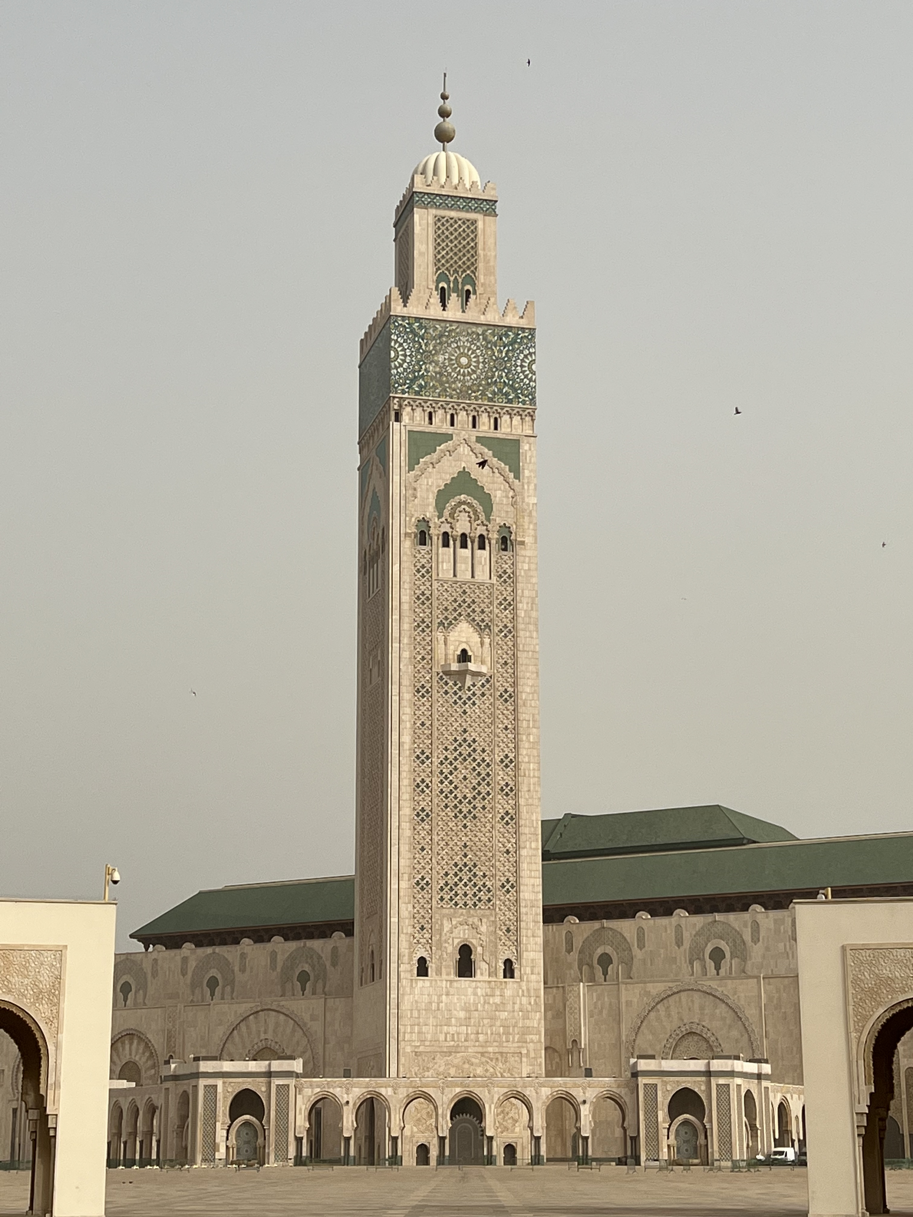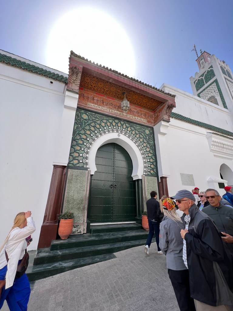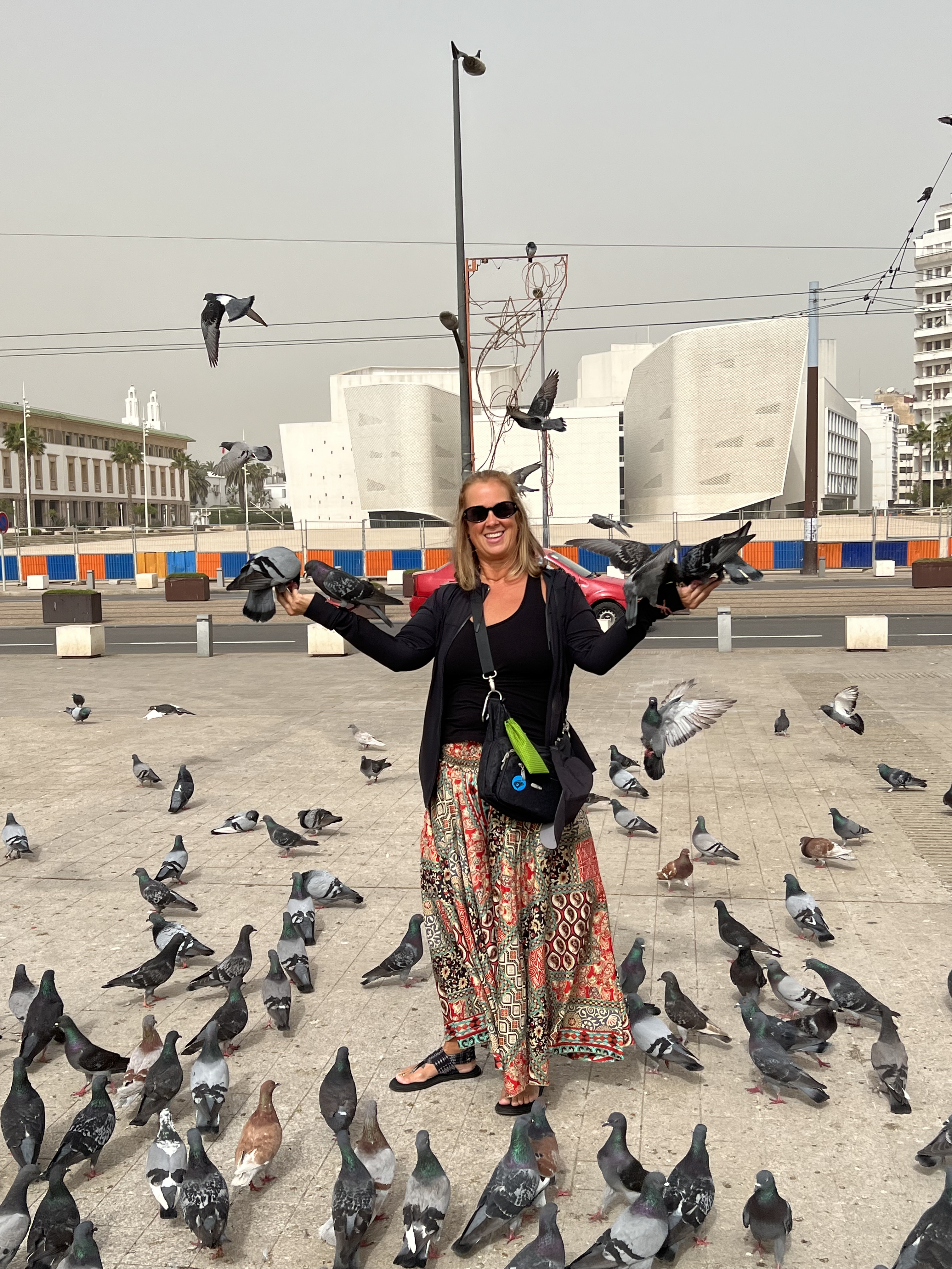 Good morning from the port of Casablanca. Today is a long one and we were up early and ready to tackle the days adventure. The alarm went off at 5:45am and breakfast was delivered at 6:00am. We ate in our room as we got ready and then headed to the Main stage to meet our excursion group at 7:15am. We wore our new pants we bought in the Canary Islands today and we got so many compliments on them. I wish I had bought more! They also made for great photos. There was a large group going to Marrakesh today on a 12+ hour excursion and our group was four buses going to Casablanca and Rabat on a 10 hour excursion. We left the pier and got stuck at the gate before even leaving the port. I guess our bus driver made an illegal turn and had to pay a $40.00 fine before we could even leave delaying us another 30minutes. Luckily, that was not an omen of the things to come for the rest of the day. In Casablanca we stopped at The Hassan the II Mosque. It is the third largest Mosque in the world. King Hassan the II had this built in seven years and ordered the workers to work around the clock until it was finished in 1993. He wanted to see it done before he died. Ironically, it was finished six years before he passed away. Ahhhh, it’s good to be king right? We saw the only Catholic church still offering services in Casablanca, the Mohammad the V Mosque, and the Mohammad the V square. Today was the day for uniquely beautiful doors with hand made knockers, tile mosaics and arches in every shape and size. Some we barely passed through in our bus and several we walked though. The architecture was so unique to Morocco and will forever be embedded in my memory. We had an absolutely wonderful time feeding the pigeons (flying rats as my mom calls them) in the square. We have such joyous memories of doing this in multiple places around the world and today was no exception. The man charged $1.00 for bird food and we gave him $5.00 and told him to keep the change. He kept filling our hands with more food until it was time to get back on the bus. I finally had to say no thank you, no more please. It always feels wonderful to bless another human and sometimes something so small means so very much. From Casablanca we drove to the Capitol city of Rabat, about an hour away. The King arrived in Casablanca yesterday and we saw the palace there, but he lives in Rabat normally and today we visited the palace there as well. Then we went to the Mausoleum of Mohammad the V and saw the architectural marvel that is an unfinished Mosque. It has 360 granite pillars the were erected to support the Mosque, but it was never completed so all that remains are its ruins. There is an unfinished spire here and we were lucky enough to be standing in front of the spire at noon when the call to prayer came to pass from the speaker on top of it. We could hear the announcement being echoed throughout the city from the mountain top we were on and it was quite a moving experience. From there we went to a local restaurant and had a traditional Moroccan lunch. We were served a salad or marinated vegetables, followed by Chicken Tangine and stewed beefed over couscous with cooked carrots, cabbage, zucchini, and potatoes, lastly, the brought a large bowl of fresh strawberries, oranges and Loquat. I had never had Loquat before and a passenger showed us how to peel it and eat it. It was delicious and I am excited to have tried something new. After lunch we boarded the bus and had one last stop at the Kabash Oudaya. It was once used as military base and it now alleys of shops, homes and restaurants. The view from the top of the wall looking out over the Atlantic Ocean was beautiful and a fabulous spot to take photos. After we left the Kabash we had a scenic drive along the coastline for a bit before getting back on the freeway and heading back to Casablanca and the port. Today was also the day of a 100 cats. Megan had fun loving on cats all over Morocco today. Every shape and size imaginable. There are so many photos we took today but there are already 66 photos attached below so I will save those for another time. We were back on the ship by about 5:30pm. We had a large late lunch and opted to just order some light bites from room service around 7:00pm and stayed in for the rest of the night. We have another long excursion and adventures ahead for us tomorrow so we are heading to sleep and hope to sleep fast. Enjoy all the photos, oh and the sunset photos is compliments of a fellow passenger, it’s so beautiful. I will “see” you tomorrow. Hugs.
