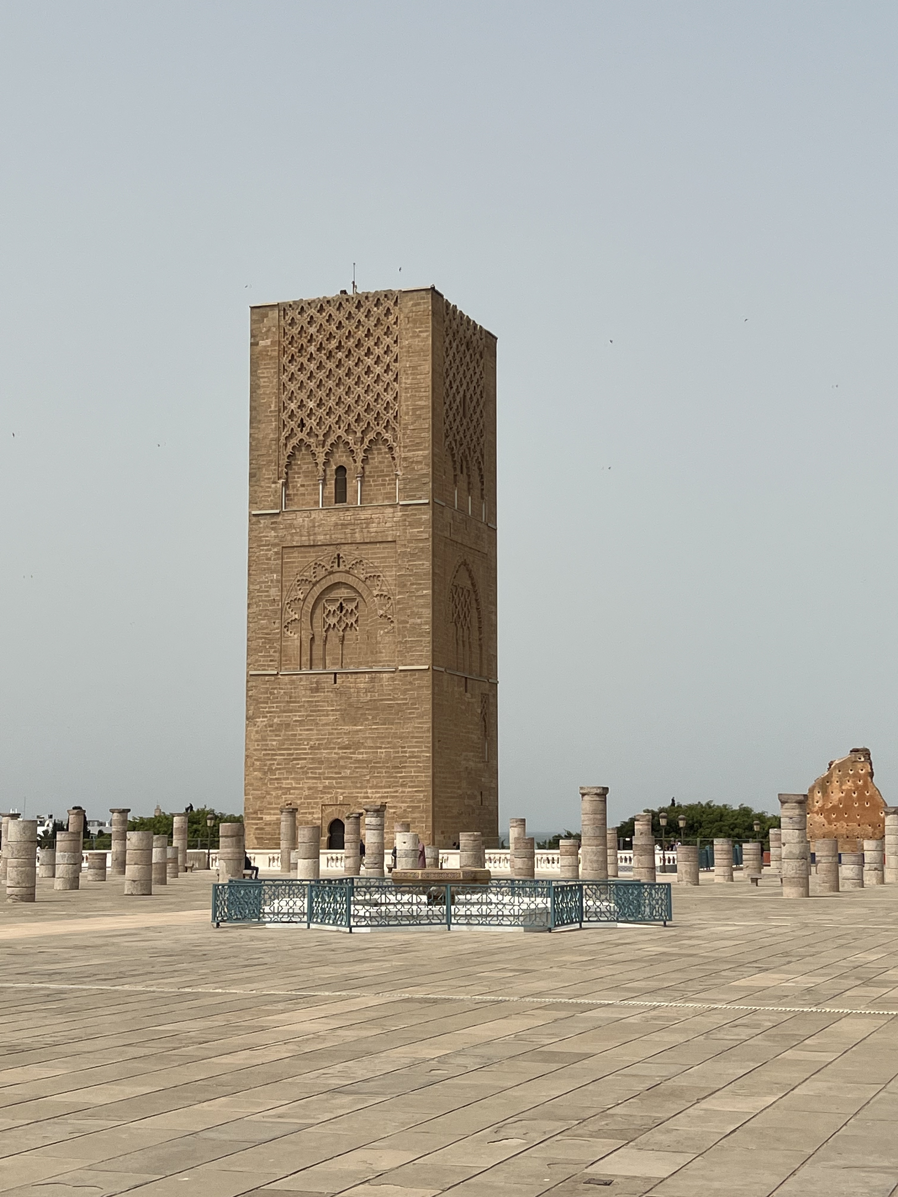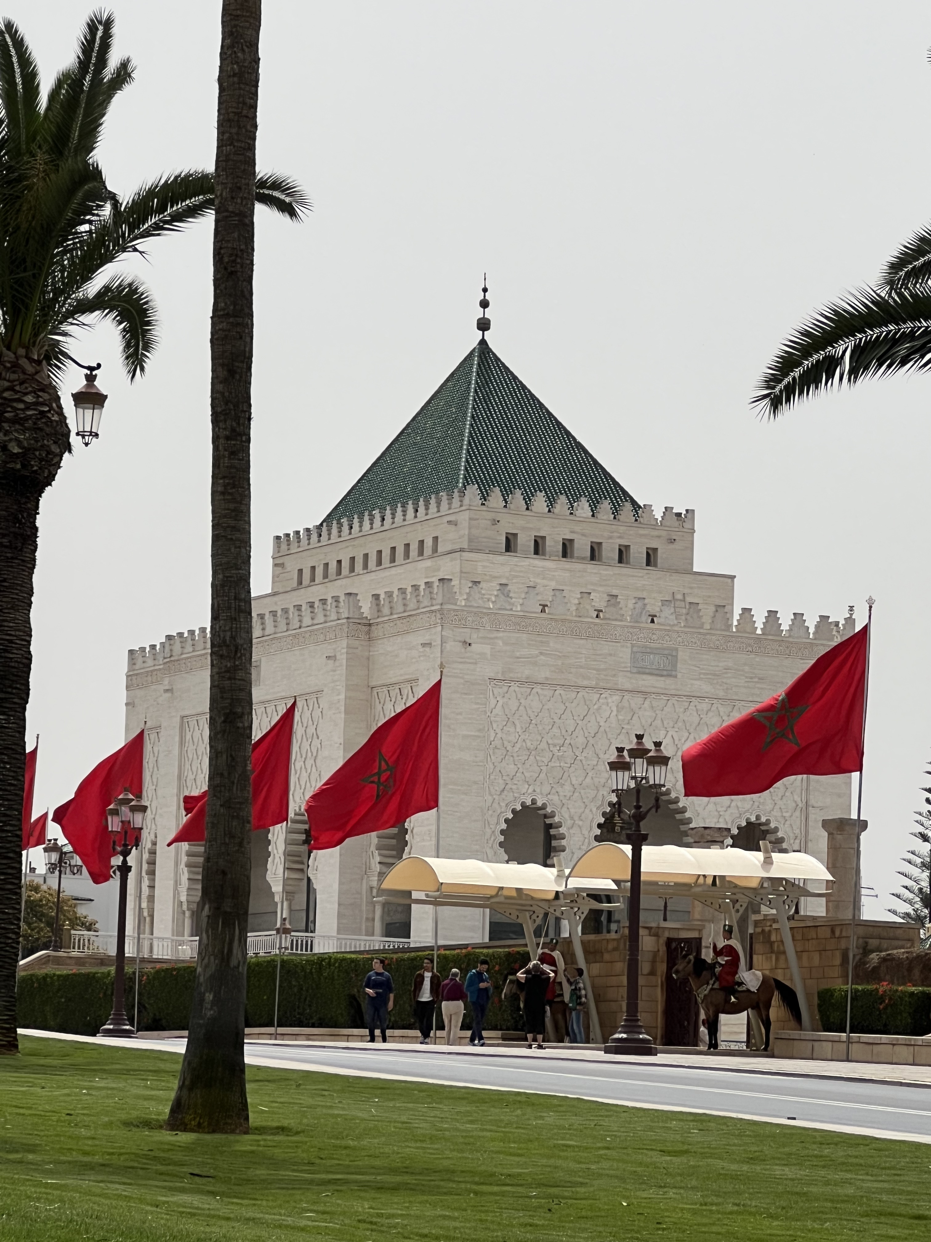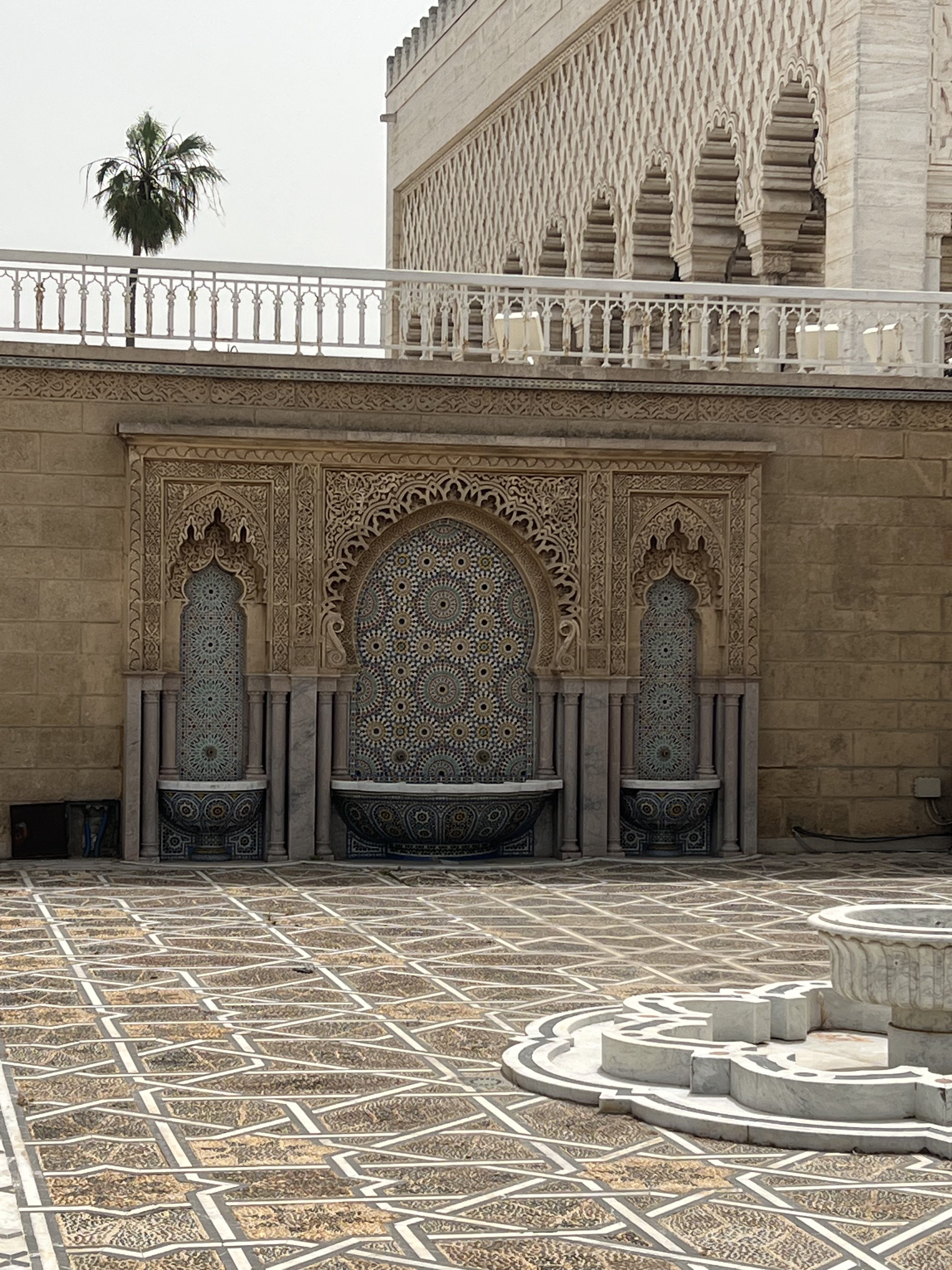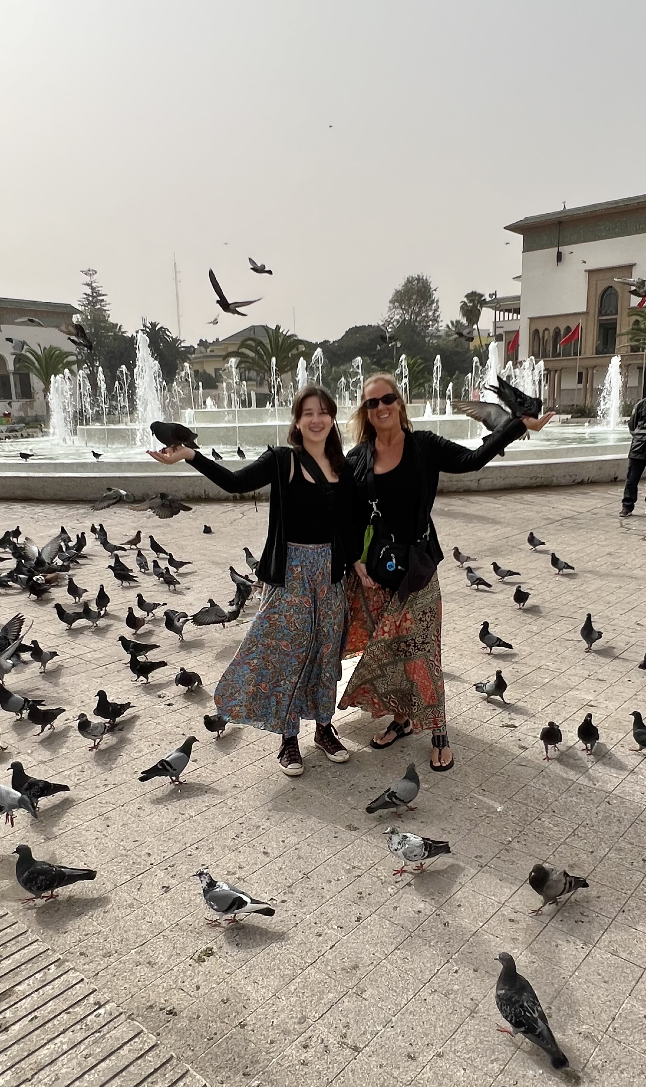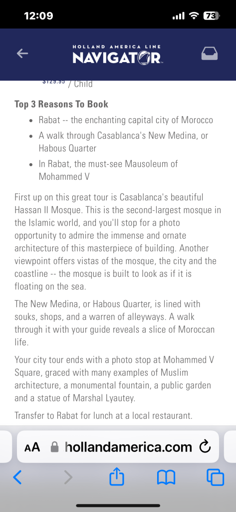 Good morning from the port of Casablanca. Today is a long one and we were up early and ready to tackle the days adventure. The alarm went off at 5:45am and breakfast was delivered at 6:00am. We ate in our room as we got ready and then headed to the Main stage to meet our excursion group at 7:15am. We wore our new pants we bought in the Canary Islands today and we got so many compliments on them. I wish I had bought more! They also made for great photos. There was a large group going to Marrakesh today on a 12+ hour excursion and our group was four buses going to Casablanca and Rabat on a 10 hour excursion. We left the pier and got stuck at the gate before even leaving the port. I guess our bus driver made an illegal turn and had to pay a $40.00 fine before we could even leave delaying us another 30minutes. Luckily, that was not an omen of the things to come for the rest of the day. In Casablanca we stopped at The Hassan the II Mosque. It is the third largest Mosque in the world. King Hassan the II had this built in seven years and ordered the workers to work around the clock until it was finished in 1993. He wanted to see it done before he died. Ironically, it was finished six years before he passed away. Ahhhh, it’s good to be king right? We saw the only Catholic church still offering services in Casablanca, the Mohammad the V Mosque, and the Mohammad the V square. Today was the day for uniquely beautiful doors with hand made knockers, tile mosaics and arches in every shape and size. Some we barely passed through in our bus and several we walked though. The architecture was so unique to Morocco and will forever be embedded in my memory. We had an absolutely wonderful time feeding the pigeons (flying rats as my mom calls them) in the square. We have such joyous memories of doing this in multiple places around the world and today was no exception. The man charged $1.00 for bird food and we gave him $5.00 and told him to keep the change. He kept filling our hands with more food until it was time to get back on the bus. I finally had to say no thank you, no more please. It always feels wonderful to bless another human and sometimes something so small means so very much. From Casablanca we drove to the Capitol city of Rabat, about an hour away. The King arrived in Casablanca yesterday and we saw the palace there, but he lives in Rabat normally and today we visited the palace there as well. Then we went to the Mausoleum of Mohammad the V and saw the architectural marvel that is an unfinished Mosque. It has 360 granite pillars the were erected to support the Mosque, but it was never completed so all that remains are its ruins. There is an unfinished spire here and we were lucky enough to be standing in front of the spire at noon when the call to prayer came to pass from the speaker on top of it. We could hear the announcement being echoed throughout the city from the mountain top we were on and it was quite a moving experience. From there we went to a local restaurant and had a traditional Moroccan lunch. We were served a salad or marinated vegetables, followed by Chicken Tangine and stewed beefed over couscous with cooked carrots, cabbage, zucchini, and potatoes, lastly, the brought a large bowl of fresh strawberries, oranges and Loquat. I had never had Loquat before and a passenger showed us how to peel it and eat it. It was delicious and I am excited to have tried something new. After lunch we boarded the bus and had one last stop at the Kabash Oudaya. It was once used as military base and it now alleys of shops, homes and restaurants. The view from the top of the wall looking out over the Atlantic Ocean was beautiful and a fabulous spot to take photos. After we left the Kabash we had a scenic drive along the coastline for a bit before getting back on the freeway and heading back to Casablanca and the port. Today was also the day of a 100 cats. Megan had fun loving on cats all over Morocco today. Every shape and size imaginable. There are so many photos we took today but there are already 66 photos attached below so I will save those for another time. We were back on the ship by about 5:30pm. We had a large late lunch and opted to just order some light bites from room service around 7:00pm and stayed in for the rest of the night. We have another long excursion and adventures ahead for us tomorrow so we are heading to sleep and hope to sleep fast. Enjoy all the photos, oh and the sunset photos is compliments of a fellow passenger, it’s so beautiful. I will “see” you tomorrow. Hugs.