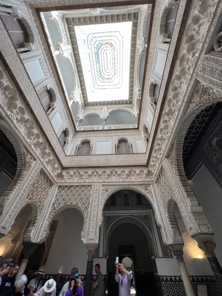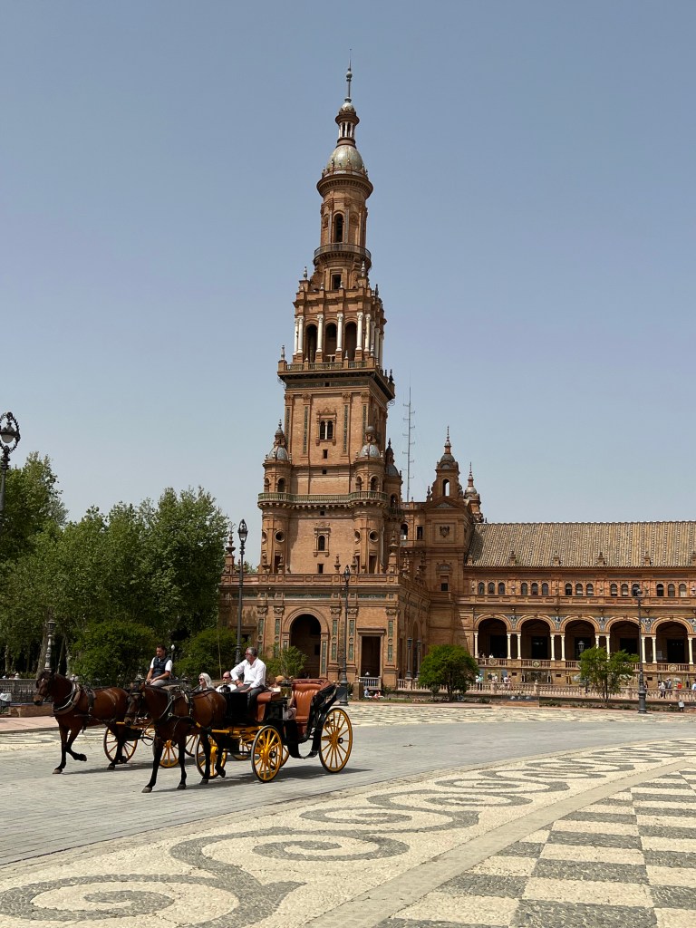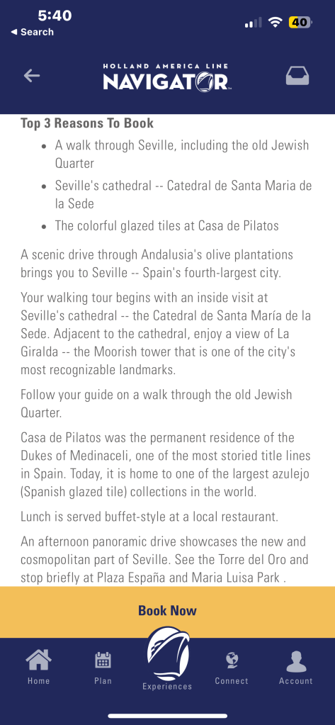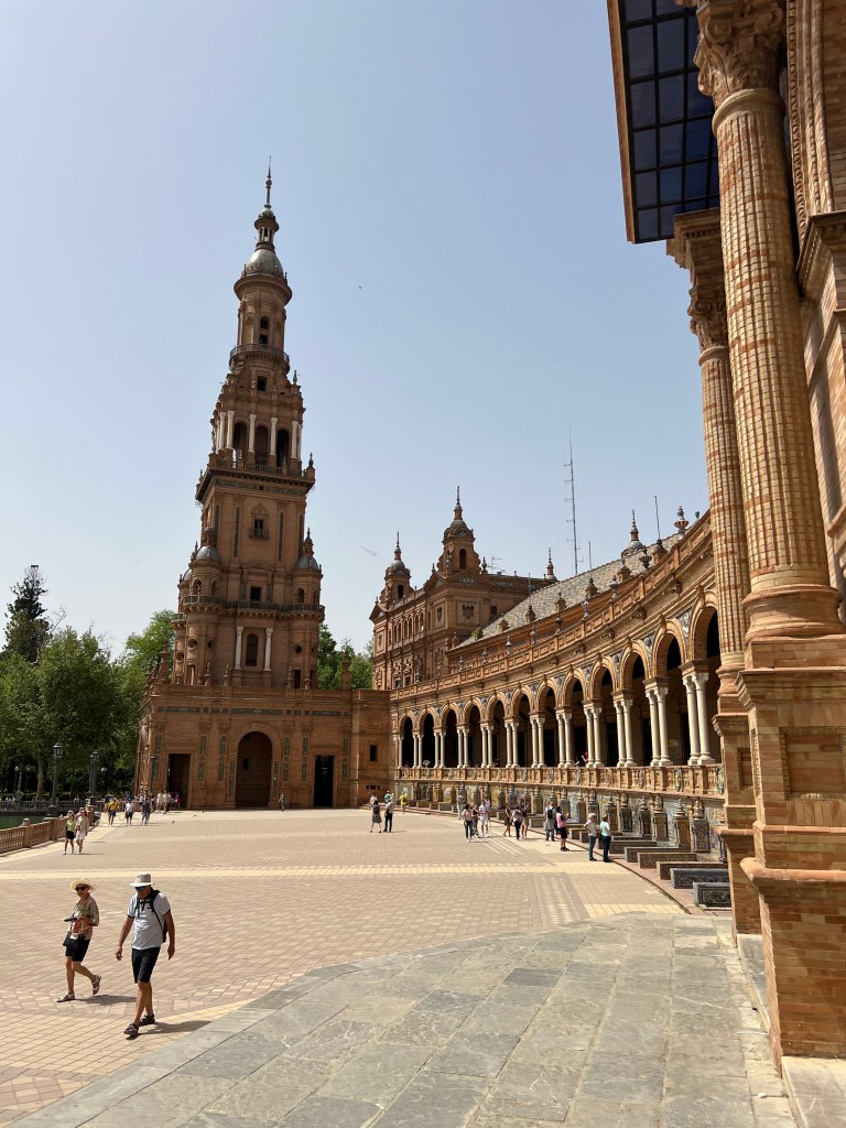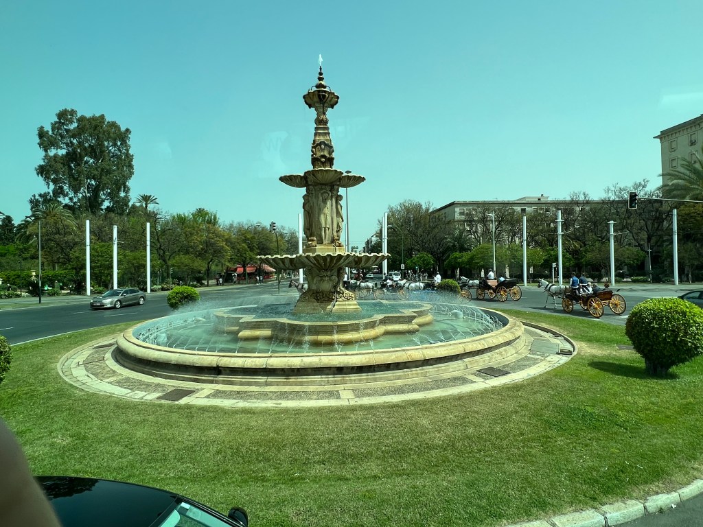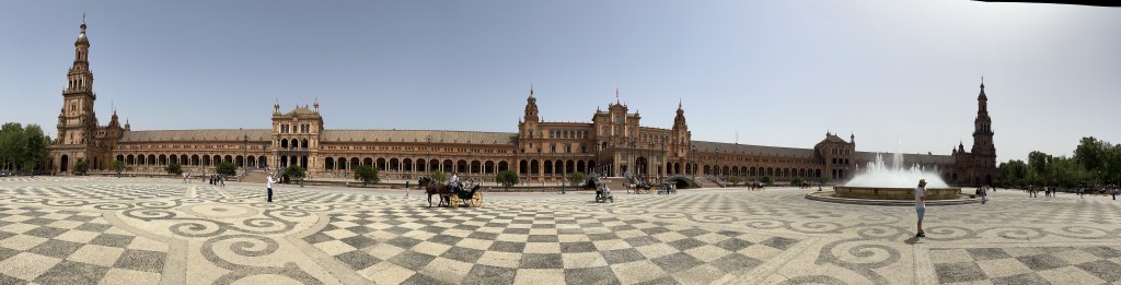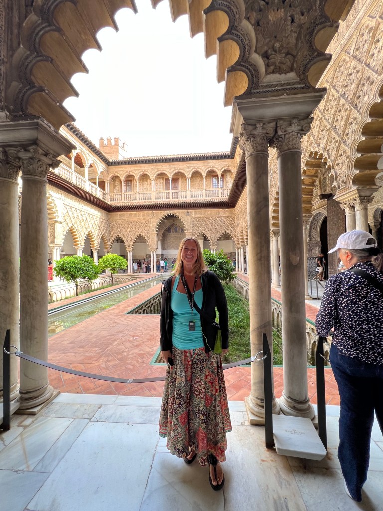 Feliz Pascua from Spain. Happy Easter. We started our morning with the knocking on our door again this morning. In my defense alarm was set for 6:45. Room service was scheduled for 7:00 and they can come 15 minutes anther way. They were there around 6:40. At least I heard them knock on the door this morning. Reminder to self, make sure I wear pajamas on days we order room service for breakfast. Lol!! I had my “dyed”hard boiled eggs this morning in true Easter tradition. We had an hour to get ourselves ready to meet our excursion group at 8:15 am in the main stage. Cadiz is the oldest city in Spain and was founded almost 3,000 years ago by the Phoenicians. This is Holy Week here is Spain and over the last two days there have been many parades and processions through the streets of town as they carried large statues in honor of the holiday. Today, being Easter, the town was quiet as most people don’t have to work today (unless you work in the tourist business and there is a ship in port). As we left Cadiz we drove over the Puente De La Constitución De 1812, the largest bridge in Spain. It was designed to allow large ships to pass under it. We had a two hour bus ride to the city of Seville. We had a comfort stop about halfway at a rest stop where there was a market and coffee shop. Megan and I got some caffeinated beverages cause we were dragging our wagons a little. Not really sure how we made these choices when booking our excursions, but the way I look at it is, in the future when I come back here, I’ll be able to spend more time in the port cities and less time on a bus. As we came into Seville we drove by the the soccer stadium and then got off the bus at the Maria Luisa Park. In 1914 it was decided that the friendship between the Americas and Spain needed to be celebrated and honored. They decided to hold a grand world’s fair but it took ten years to raise the money to have the celebration. In 1925 they started to build the park and all the trees, imported from America, then the two main squares and the hotel. It took 4 years and 10k men to complete the project. A wall was made with bricks, marble, and stone to surround the park. There are 58 benches all along the wall of the square to represent the 58 providences in Spain. They are all covered in painted tiles. Those tiles are all made in Seville. There are many pavilions (buildings and castle like structures) representing different countries. Spain’s is the biggest. Once we got off the bus, our first stop at the park was to see a large statue erected in honor of Christopher Columbus and his discovery of the Americas. Christopher Columbus sailed from Seville to Cadiz and then on to Americas. The navigators all came back to Seville with the gold and silver that they brought back from the Americas. They used their fortunes to bless this community. Columbus is actually buried here in Seville, a fact I learned today. As we walked through the square there were flamenco dancers performing in the streets and I wish we had had more time to stop and watch them. Our next stop on our walking tour was to the Visita Real Alcazar de Sevilla. This Castle originally started as a Moorish castle in the 10th century. The King of Spain renamed this area the Santa Cruz district in the 13th century. Also, known as the district of the holy cross. In the 15th century the Kings of Spain lived here. The kings loved this castle so much they added to it a little at a time to construct the grand structure we saw today. It is still a royal residence when the kings of Spain come here today. They close it to the public when they are here. This entire area was a Jewish community with the typical Jewish quarter with very narrow streets, winding streets small squares. It is very easy to get lost and we were strongly encouraged to stay with our guide and not wander away. There are three UNESCO world heritage sights all in the square here. The Visita Real Alcazar de Sevilla, the Cathedral de Santa María de Sede la 1929, and the Archivo de Indias. We could not visit the cathedral because it is Easter and there are services being held today. But we got to see and hear the bell tower. It has 25 bells that ring in scheduled sequence. At 12:30pm the bells rang with joyous jubilation. They marked the end of Lent, the end of Holy week and the start of the bull fighting season which officially starts today. It is their “Super Bowl” of bullfighting days. It was overwhelming to hear those bells ringing while standing in a centuries old castle, on Easter, in Spain. I was moved to tears and it was another moment of imbedded memories for me for this trip. After we left the castle we had a chance to walk through the alleyways and see shops and cafes. We were also given about thirty minutes of free time to do some shopping. Megan and I had a lot of fun running back to shop where they were making toffee coasted almonds and the smell drew us right back. They were still warm and they were delicious. We then headed to the bus for a five minute drive to the restaurant where we had lunch. The dessert was the best part of lunch to write home about, cream puffs with a hot chocolate dipping sauce. Megan and I each had an espresso and we were zinging for the rest of the day. After we left the restaurant we walked across the street to The Plaza de España. It has been used as a filming location, including scenes for Lawrence of Arabia(1962), Star Wars: Episode II – Attack of the Clones(2002) in exterior shots of the City of Theed on the Planet Naboo and it was also used in the movie Night and Day. This Plaza was our second WOW moment of our time here in Spain. Again, my photos do not do it justice. The buildings are exquisite. There is a beautiful water fountain in the middle and moat of sort with boats you can rent a trip in, much like Venice There are multiple walking bridges that take you over the water way and in the center there is a round about where the horse drawn car
