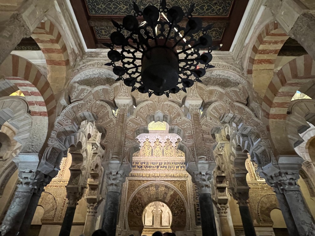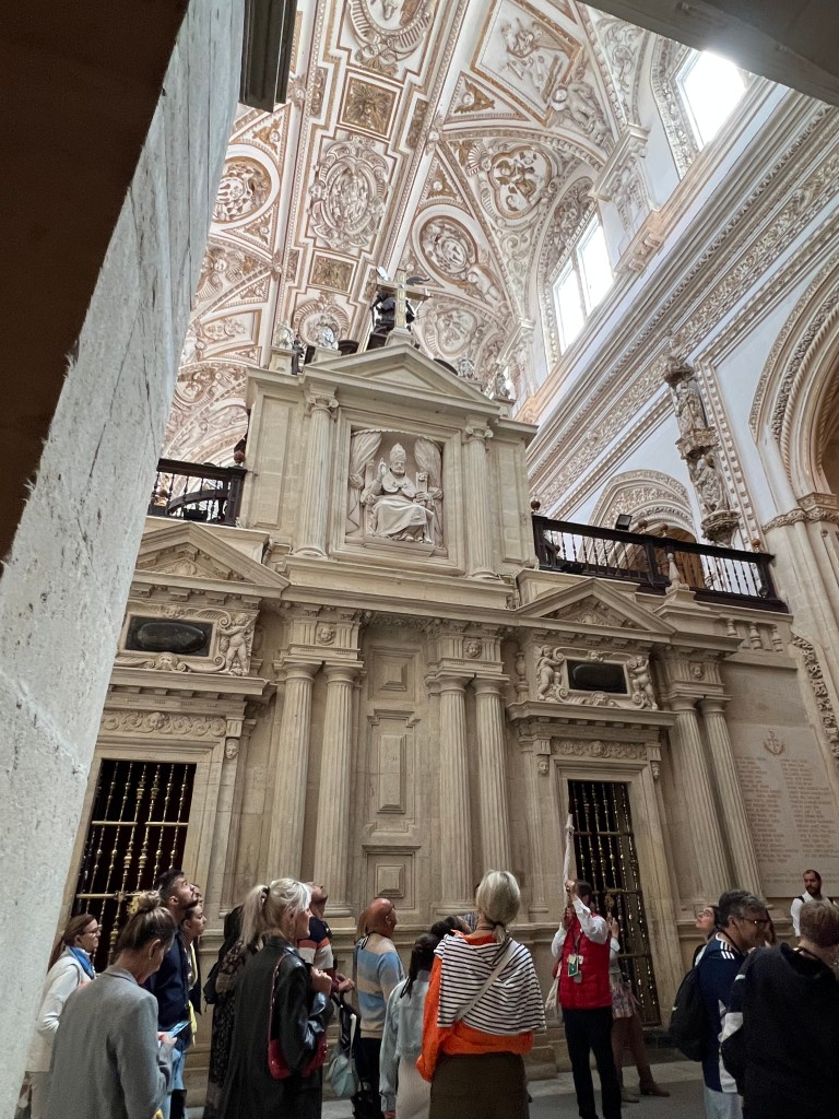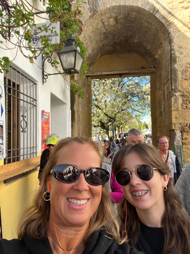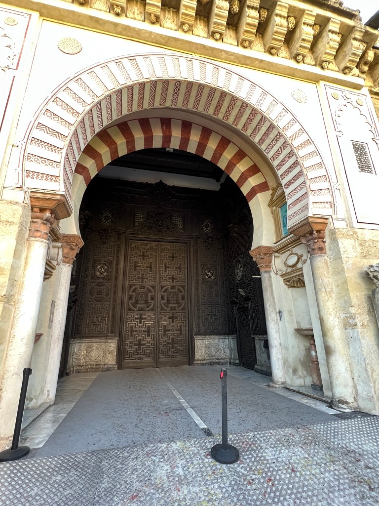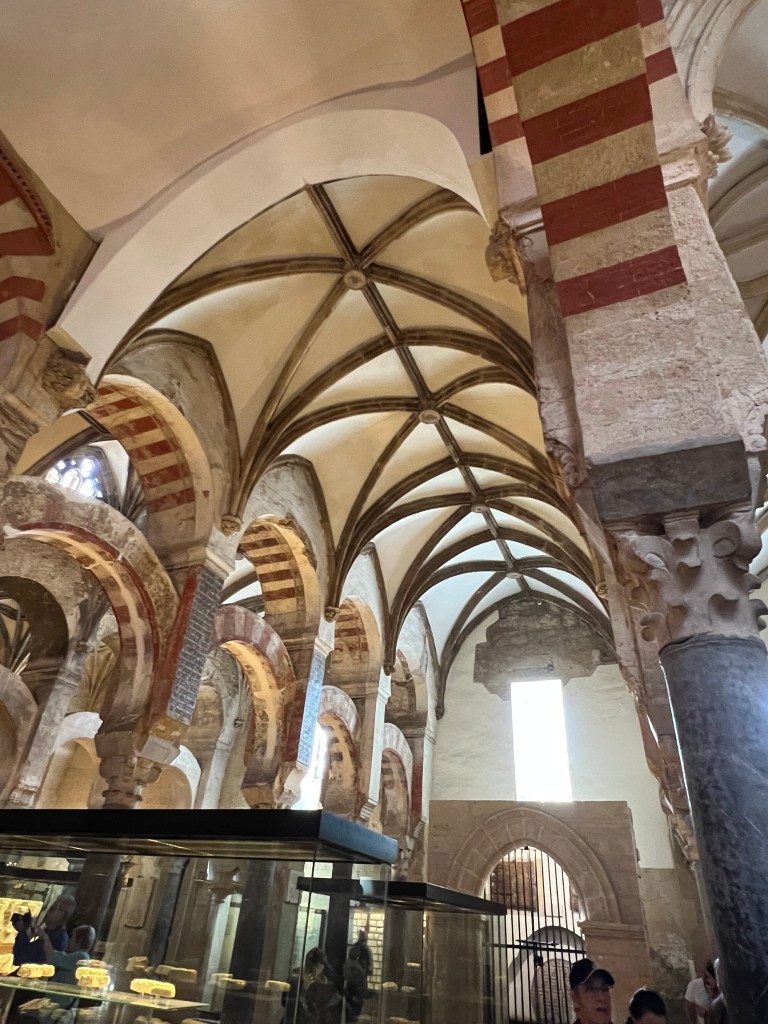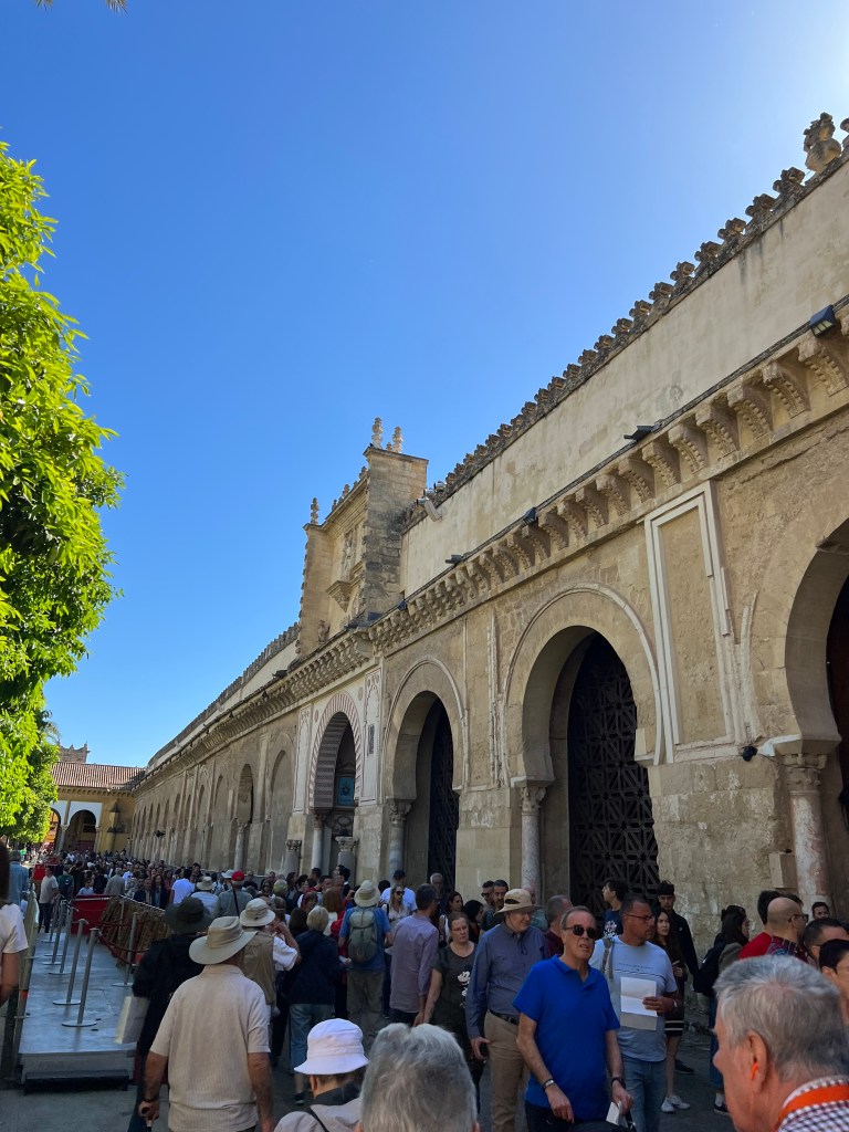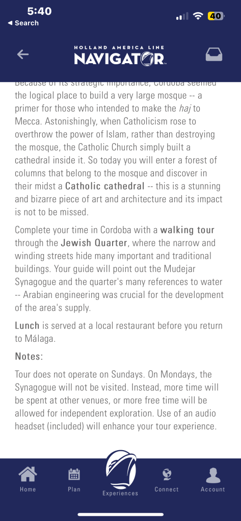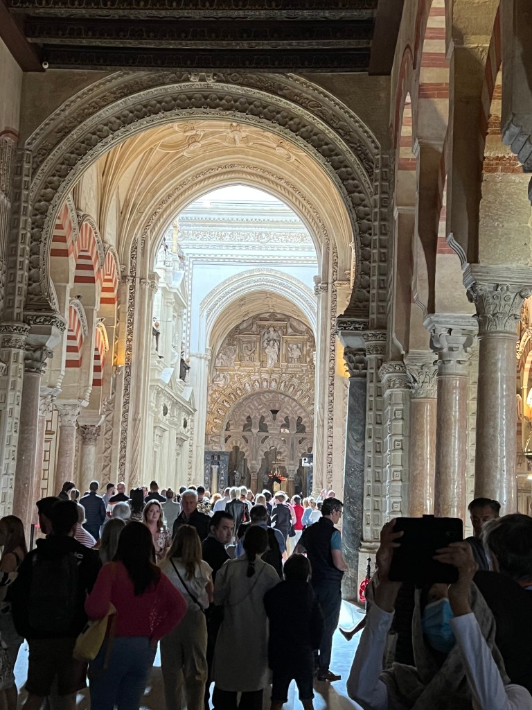 This morning we woke up in Malaga Spain even before the sun was up. Last night we moved our clocks ahead TWO hours and that 7am wake up call felt like the 5am it was to our bodies. It’s a good things we ordered room service because my alarm didn’t go off, I didn’t hear him knock on the door, so they called and woke us up. We had an hour to get ready before we had to be at the Main Stage to meet our tour group at 8:00 am. Today we took a brief driving tour around the town of Malaga and saw the fountain, the kasbah, the soccer stadium, the bullfighting stadium (where they have actual bullfighting, in Morocco they’ve deemed it inhumane so they are all shut down), a couple of churches and some historic building before we headed to the freeway. We took a two hour drive to the city of Cordoba. Along the way we passed through miles and miles of olive trees and then vineyards. The olive trees are actually called “The Sea of Olives” and spans 1.3 million hectares (3212369.959 acres) and over 180 million olive trees and are between Jaén and Estepa. This area is currently under candidacy for being registered as UNESCO World Heritage sight. It would be Spain’s 49th sight if approved. Once we arrived in Cordoba, we had a great walking tour all around the old town section of Cordoba. We first visited the old Jewish quarter and the Mudejar Synagogue. This synagogue had been covered over with plaster and paint and was discovered during a renovation of the building that was at that time a hospital. We found a Starbucks and had a brief break so, Megan and I took a quick run over to enjoy our first “home” treat in a long time. The highlight of todays trip by far was the Great Mosque of Cordoba also called the Mosque-Cathedral of Cordoba. They started construction in 785 and continued to add on to it for centuries. It was used as a temple, a Catholic Church and a Mosque. The building was so rich in religious artifacts, symbols, statues and paintings. I kept catching myself saying WOW. It is one of the most beautiful places I have ever seen before. There are two pipe organs and multiple alters. The brick-and-stone striped arches are supported by 856 granite and marble pillars. There is a bell tower in the courtyard that stands over 150 feet tall. It is the largest urban center declared World Heritage Site by the UNESCO. I took so many photos and they pale in comparison to what we actually saw. After our visit to the church we walked through the narrow passages, walkways and alleys to a lovely restaurant where we had lunch. We were served a chilled tomato soup, meat and potatoes, and frozen dessert. We were also served bottled water and red wine. It was a very traditional Spanish lunch and it was delicious. After lunch we had quite a long walk back past the Mosque through an ancient gate and across a Roman bridge to where the bus awaited on the other side. We then had a to hour drive back to the port and our ship. We had a few moments to do some quick shopping at the shops at the port, I got a magnet, Megan got a keychain and we had the opportunity to sample and then purchase some Spanish Iberico ham that was freshly carved off the leg in front of us. I will be enjoying that soon. We got back on the ship around 5:30pm and decided to go to the Main dining room for a quick dinner. Again, I wasn’t very hungry after a large lunch so I ate light. After dinner I changed into my cozies and headed to an acupuncture appointment. I am happy to say my hip is better today. Three days of almost 10k steps every day and lots of sitting on a bus and I am happy to report that I am not in pain this evening. I am writing my blog so I can go to bed, because with these crazy schedules I know if I don’t do it now I will forget everything I did today by this time tomorrow. Such busy days, such little sleep, and so many blessings in everything I am getting to do and see. Again, another day of an overwhelming number of photos. Please enjoy them. I encourage you if you get a chance to look up the Mosque we visited today and learn about it and all of it’s wonderful history.
