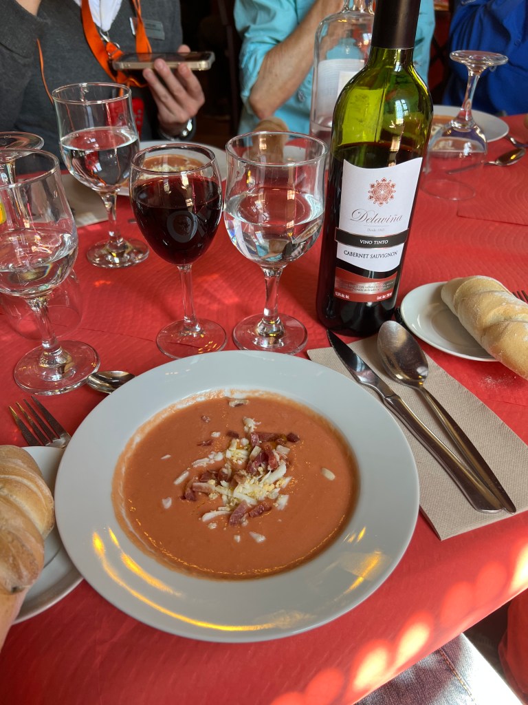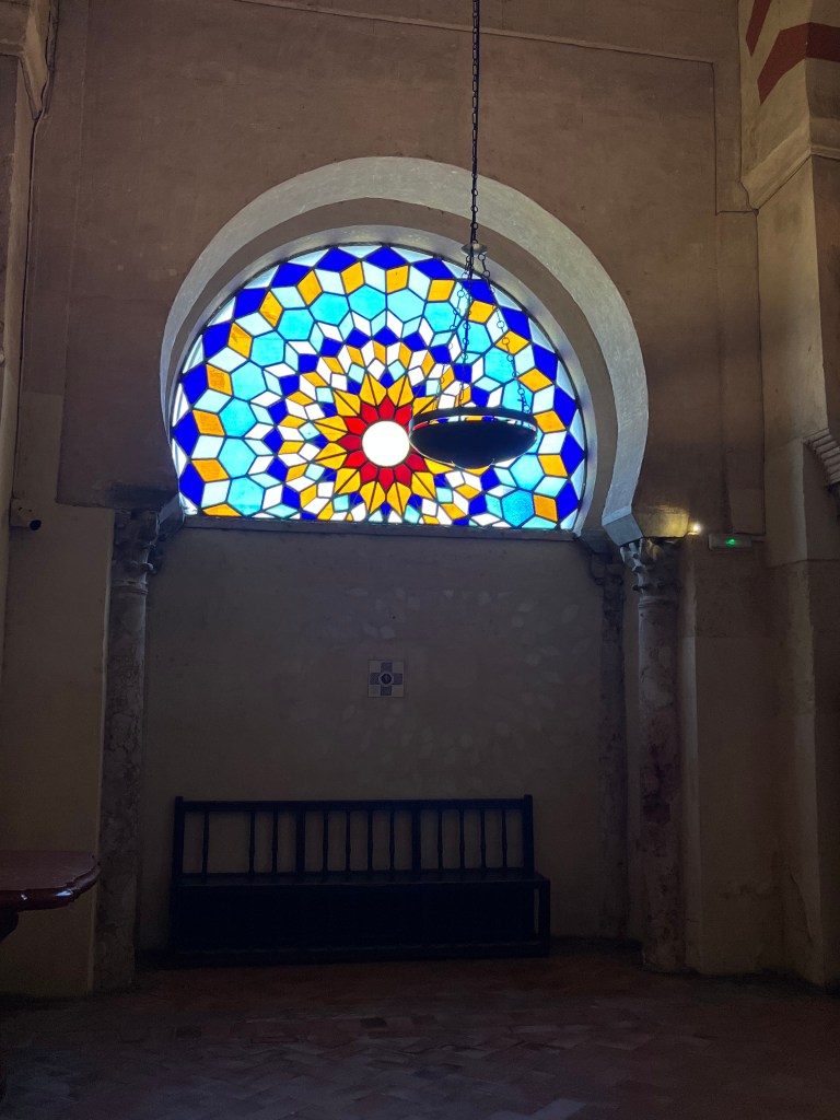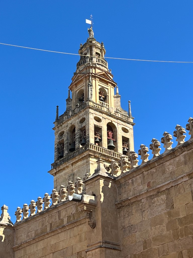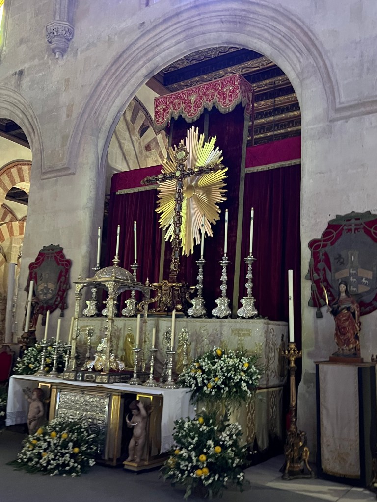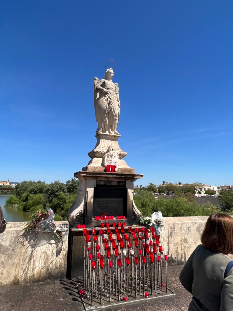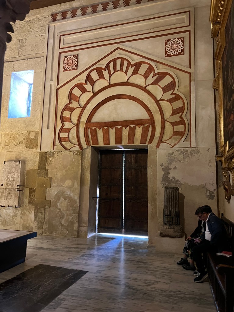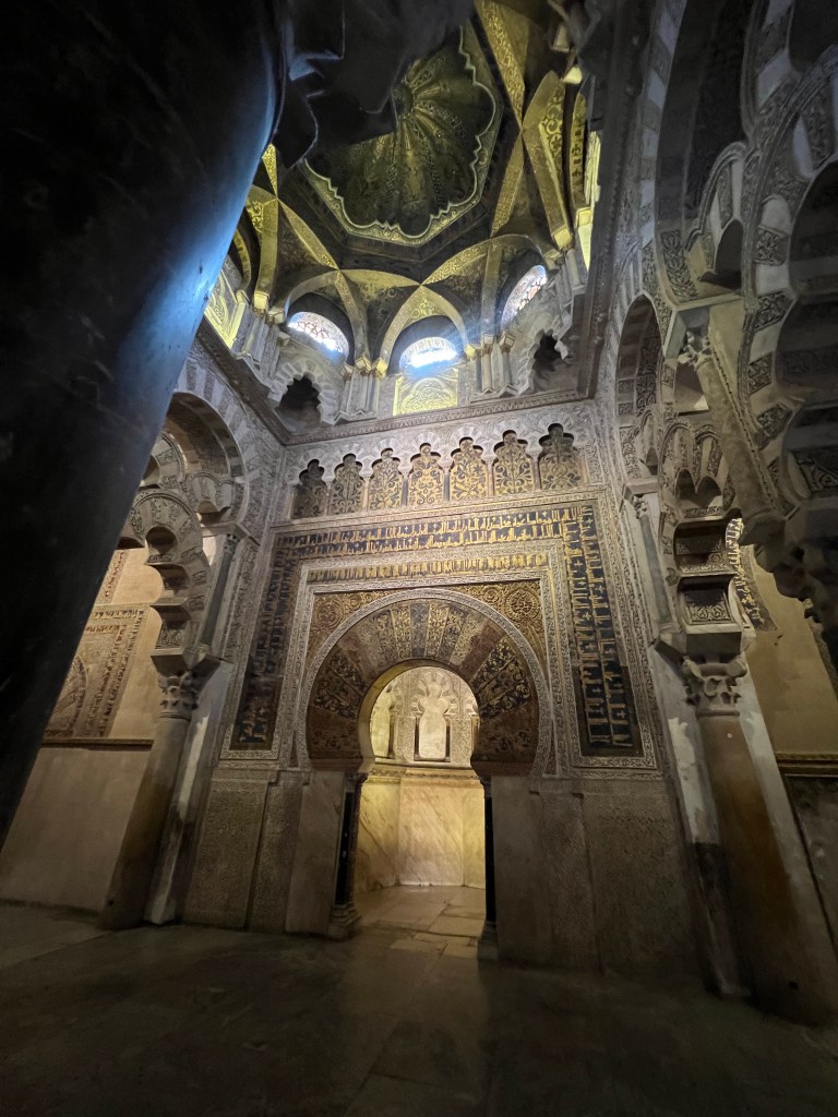 This morning we woke up in Malaga Spain even before the sun was up. Last night we moved our clocks ahead TWO hours and that 7am wake up call felt like the 5am it was to our bodies. It’s a good things we ordered room service because my alarm didn’t go off, I didn’t hear him knock on the door, so they called and woke us up. We had an hour to get ready before we had to be at the Main Stage to meet our tour group at 8:00 am. Today we took a brief driving tour around the town of Malaga and saw the fountain, the kasbah, the soccer stadium, the bullfighting stadium (where they have actual bullfighting, in Morocco they’ve deemed it inhumane so they are all shut down), a couple of churches and some historic building before we headed to the freeway. We took a two hour drive to the city of Cordoba. Along the way we passed through miles and miles of olive trees and then vineyards. The olive trees are actually called “The Sea of Olives” and spans 1.3 million hectares (3212369.959 acres) and over 180 million olive trees and are between Jaén and Estepa. This area is currently under candidacy for being registered as UNESCO World Heritage sight. It would be Spain’s 49th sight if approved. Once we arrived in Cordoba, we had a great walking tour all around the old town section of Cordoba. We first visited the old Jewish quarter and the Mudejar Synagogue. This synagogue had been covered over with plaster and paint and was discovered during a renovation of the building that was at that time a hospital. We found a Starbucks and had a brief break so, Megan and I took a quick run over to enjoy our first “home” treat in a long time. The highlight of todays trip by far was the Great Mosque of Cordoba also called the Mosque-Cathedral of Cordoba. They started construction in 785 and continued to add on to it for centuries. It was used as a temple, a Catholic Church and a Mosque. The building was so rich in religious artifacts, symbols, statues and paintings. I kept catching myself saying WOW. It is one of the most beautiful places I have ever seen before. There are two pipe organs and multiple alters. The brick-and-stone striped arches are supported by 856 granite and marble pillars. There is a bell tower in the courtyard that stands over 150 feet tall. It is the largest urban center declared World Heritage Site by the UNESCO. I took so many photos and they pale in comparison to what we actually saw. After our visit to the church we walked through the narrow passages, walkways and alleys to a lovely restaurant where we had lunch. We were served a chilled tomato soup, meat and potatoes, and frozen dessert. We were also served bottled water and red wine. It was a very traditional Spanish lunch and it was delicious. After lunch we had quite a long walk back past the Mosque through an ancient gate and across a Roman bridge to where the bus awaited on the other side. We then had a to hour drive back to the port and our ship. We had a few moments to do some quick shopping at the shops at the port, I got a magnet, Megan got a keychain and we had the opportunity to sample and then purchase some Spanish Iberico ham that was freshly carved off the leg in front of us. I will be enjoying that soon. We got back on the ship around 5:30pm and decided to go to the Main dining room for a quick dinner. Again, I wasn’t very hungry after a large lunch so I ate light. After dinner I changed into my cozies and headed to an acupuncture appointment. I am happy to say my hip is better today. Three days of almost 10k steps every day and lots of sitting on a bus and I am happy to report that I am not in pain this evening. I am writing my blog so I can go to bed, because with these crazy schedules I know if I don’t do it now I will forget everything I did today by this time tomorrow. Such busy days, such little sleep, and so many blessings in everything I am getting to do and see. Again, another day of an overwhelming number of photos. Please enjoy them. I encourage you if you get a chance to look up the Mosque we visited today and learn about it and all of it’s wonderful history.