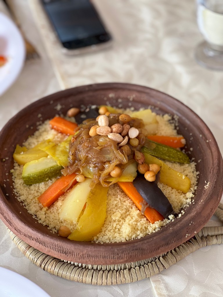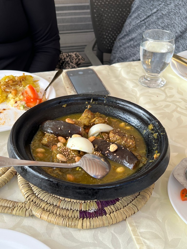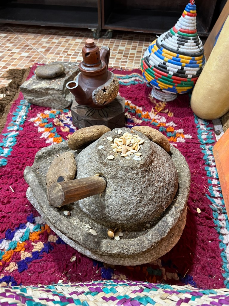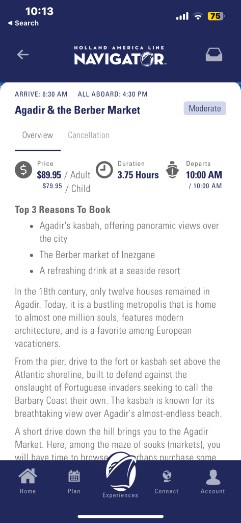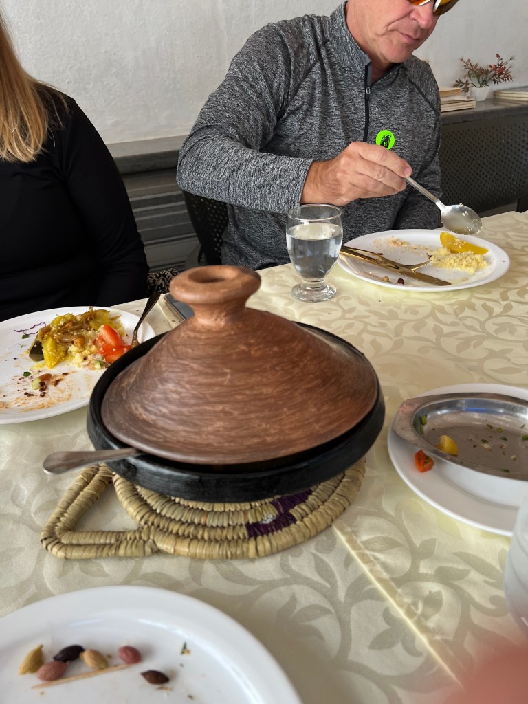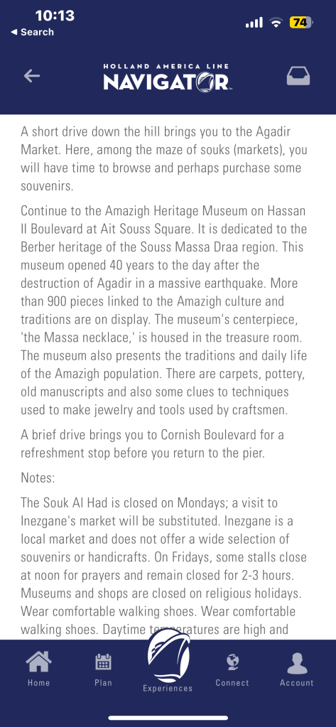 Hello from Morocco. Last night we sailed across the Atlantic Ocean from eh Canary Islands back to the continent of Africa for our next three port of call in Morocco. The winds reach storm classification last night at a speed of 50 knots. We could hear it whistling through the seal on a balcony door. So not a great nights sleep, but not absolutely horrible. We awoke this morning still making our approach into the pier. We had a later arrival then planned and therefore it delayed our excursions as well. Megan and I headed to the Pinnacle Grill for breakfast. We hadn’t eaten in there in a while. As it is predominantly Muslim here in Morocco and especially since it is in the season of Ramadan, we are dressing out of respect to the religion and culture while we are here. Originally, we were prepared to do it on days we were visiting churches, but we decided this morning we will do it the whole time we are here. So no bare shoulders, no mid drifts shirts and no bare knees. We met our excursion group on the Main Stage around 10:00 for our tour of Agadir and the Berber market. We had a scenic drive around the town and so many beautiful things. Our first stop was at the Kasbah that is being rebuilt on the original sight of a 16th century structure. In 1960 an earthquake destroyed the entire city of Agadir and they have been rebuilding it ever since. During the reconstruction human bones were discovered and the renovation work stopped. There was a lovely panoramic view of the city from this mountain top which is 700 feet in elevation. There were locals there with Camels, baby goats and snakes all urging us to take pictures for a price. After we left the Kasbah we drove into the city and visited an Argon oil manufacturer. This particular collective is run by women. We purchase some Jasmine infused Argon oil. They told us the history of Argon production here in Morocco as it is one of their largest exports. It is also a Unesco Biosphere Reserve (like the Volcanic Park from yesterday). I had never heard of one before yesterday and now I have been to two in as many days. From there we walked to the Sundy Berber market. What an establishment this is. Over 6000 vendors and stalls of sellers inside a wall structure. You have to take picture of the entrance you use so you can make sure you leave the same way you came in. Our guide stays with us the whole time and we mostly just walked through the shops. We had about 15 minutes to shop and he gave us a small “boundary” we had to stay in do that no one wandered too far and got lost. High pressure sales is an art form here and “No” means harass me more and try and break me down to them. We bought a magnet and I bought a pair of sunglasses because I left mine on the ship. Lastly, we had a stop at a beachside cafe for a light snack of cookies and I had an apple soda and Megan had a coke. We learned a lot of information and facts about Morocco and Agadir today and I will summarize the most interesting ones I learned.