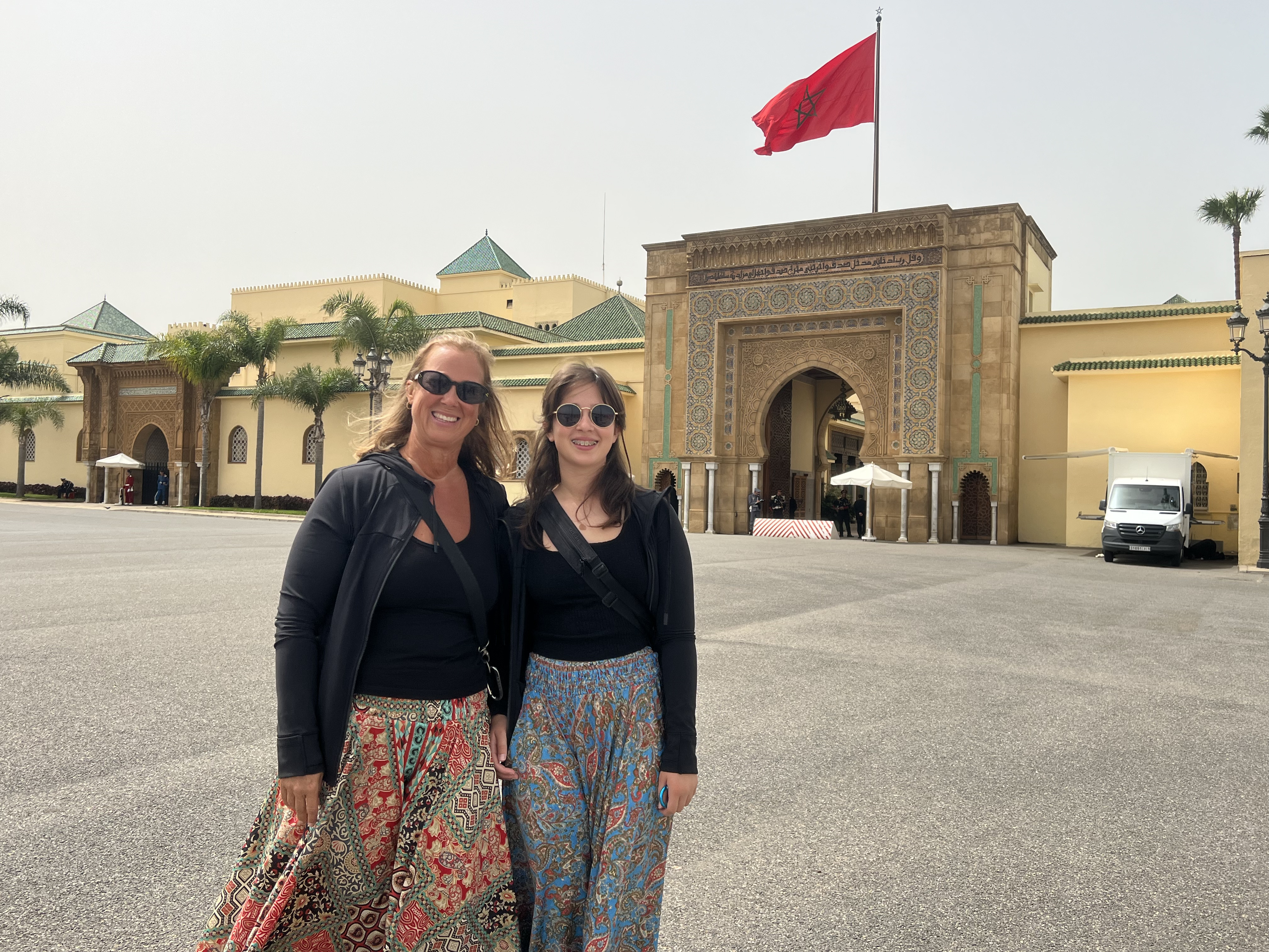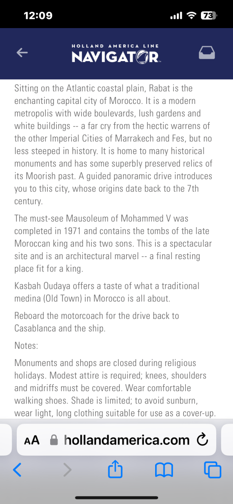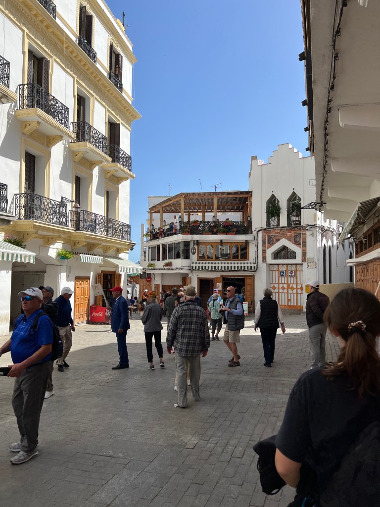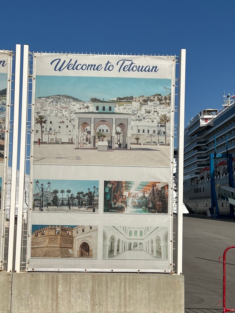 Hello, from our last port in Morocco and our final stop on the African continent of this adventure we are on. Last night when we were pulling out of port we noticed a Semester At Sea Ship with the saying “The World Is Your Campus” written on the side. Megan is getting that same experience currently but it is definitely something we will have to research later. We sailed into the Mediterranean Sea this morning as we crossed over from the Atlantic Ocean. We slept fast last night as we were exhausted from yesterday and had an early morning again today. We grabbed our breakfast from the Lido and headed to the Main Stage for our 8:15am meeting time. Our journey started today with a short drive into Tangier, which means the white pigeon. We saw the Grand souks here, the kasbah (fort), the walled old town area, St. Andrew’s Catholic Church and the American Legation Museum. We did a lot of walking today. Up and down hills, across cobblestone streets and up and down many steps. I had no problem reaching my step goal for the day. We saw so many new and wonderful things again today. Much like yesterday it was a fantastic visual variety of old, new, colorful, bustling, poverty, history and grandeur. There is so much tradition and history here in Morocco in complete contrast to the length of our own history in the United states. I wish we had more time here to experience more. Next, we boarded the bus and took an hour drive over the Reif Mountains into Tetouan. There we visited their walled souk (marketplace), the Royal Palace at Hasan II Square (so yes, if you are counting that’s three palaces belonging to the same king in two days), and finally we went to the School of Traditional Arts and Crafts. Sadly, since it is Friday and we are in the Ramadan there was no one there working on their craft, but we got to see some beautiful completed works and works in progress. I also need to mention that Morocco is the land of a zillion cats. Megan and I saw more cats then we could count. My camera is filled with photos of Megan and her feline harem. As tempting as it was to sneak one back onto the ship, we decided against it. After that we boarded back onto the bus for the hour long ride back to Tangier and the pier where the Zuiderdam was waiting for us. These three days were barely a taste of what Morocco has to show us and I look forward to returning here at a future date. I think today’s port of Tangier was my favorite. I never felt unsafe and the food again was fantastic. We had a delicious traditional Moroccan meal with vegetables, couscous, beef, rice, cookies, and mint tea for dessert. We got back to the ship just before 4:30pm and headed to the Aft pool deck on 9 for the sail away party. They had drink specials, served hummus and pita, and had live music. We stayed and enjoyed the sun for while until the wind just got too cold and we headed back to the cabin. We are winding down our evening now. We skipped dinner again after having such a filling lunch. We are hydrating and getting ready for another long day tomorrow. It will be long excursion three of five tomorrow as we are back at sea now and heading for Spain. We anticipated this month as being busy with a lot of “on the go.” We will go to sleep early and get as much rest as we can. Our excursions will drop down in length of time after this week as well. These just all ended up being about 8 hours each for multiple days in a row. We are anticipating some high winds for the evening and I’m sure we will be rocking and rolling along. Hopefully it will lull me right to sleep and keep me resting throughout the evening. Enjoy all the photos. I know there are a lot of them again. But it is so hard to decide what to share and not to share. These are my favorites from the hundreds I took. I hope you again feel like a little part of you is here, if only in my heart!. Hugs.