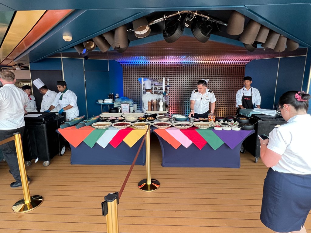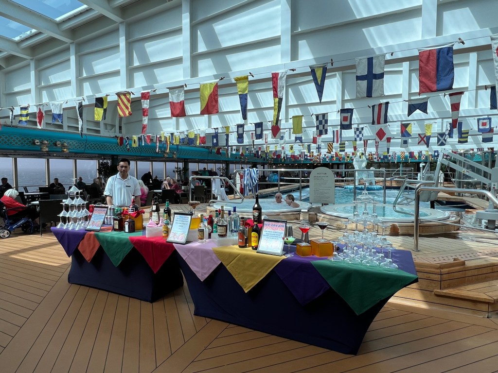 Today was one of the few sea days we are going to have this month, we have five ports days in a row starting tomorrow. It’s going to be a busy month. I was up early as we were pulling out of port around 7:00am this morning after our overnight in Agadir. The storms and winds finally died down around midnight last night and the captain announced he was happy we had opted to stay in port like we did. There was a beautiful double rainbow as we were pulling out this morning as Agadir said goodbye to us. I went and had breakfast this morning at the Neptune Lounge and I let Megan sleep in. I headed to Project Linus after and Megan came and met me there later in the morning. We spent about two hours working on our projects today. Knowing our sea days are already limited Marty is making sure everyone has all the supplies they need because Project Linus is not set up on port days. We have enough yarn to finish our current projects and a one more so we’re good to go. After Project Linus Megan went to tutoring and I went to acupuncture. We met back at the cabin around 2:30pm and then headed to the Lido poolside for an ice cream social party. They had the lido area all decorated, had drink specials like brandy Alexander and Mud slides and had an ice cream area set up with every topping you could imagine. The line lasted almost an hour with passengers coming through to make their own sundaes (some had two). I did not have any but we enjoyed sitting and watching. After the social we headed home to get ready for dinner. Tonight we had dinner in the Main Dining room at our normal time and place and had Catalin, the shopping concierge from the Effy Shop as our guest this evening. His time on the ship is coming to an end in a couple of days and we wanted to have a chance to say goodbye. There is going to be a staff and passenger turn over when we conclude the third segment of the world cruise (there were four) in Amsterdam as well. The majority of the passengers were/are on for the entire duration but there is about 50 passengers that rotate throughout the cruise. So if you ever want to do a part of the world cruise know that is an option for you. My understanding that on next years World Cruise they are breaking it into nine different segments to make it easier for travelers who can not be away for long periods of time. After dinner we took a walk around the ship, walked through the shops, and then headed home. We placed our room service order for breakfast tomorrow with a 6am delivery time. We have a 7:15am meeting time for our excursion tomorrow morning. This will be our longest excursion (not counting the safari) of this trip. 10.5 hours long as we will travel all around Casablanca, Morocco. I am excited to see all the new sights and to experience new and exciting things. I will be sure to take lots of phots and share my adventures with you as always. Have a wonderful nights rest and stay safe all!! Hugs.